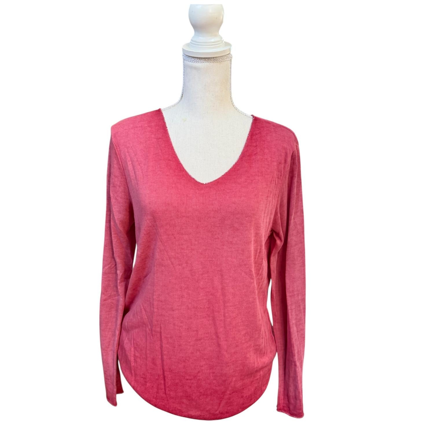Great fit, cute design, soft fabric. You'll love everything about this long sleeve tee. Experience luxurious comfort with the Women's Long Sleeved V-neck Top by Made in Italy, a popular choice for those seeking chic minimalism. This ruby-colored, solid pattern top comes in a flattering V-neck design with long sleeves, enhanced by a metallic silver trim for a touch of elegance. Composed of 90% rayon and 10% spandex, this top is expertly crafted in Italy. Enjoy the convenience of a pull-on closure and easy maintenance with machine wash and tumble dry suitability. One size fits US sizes 4 to 12