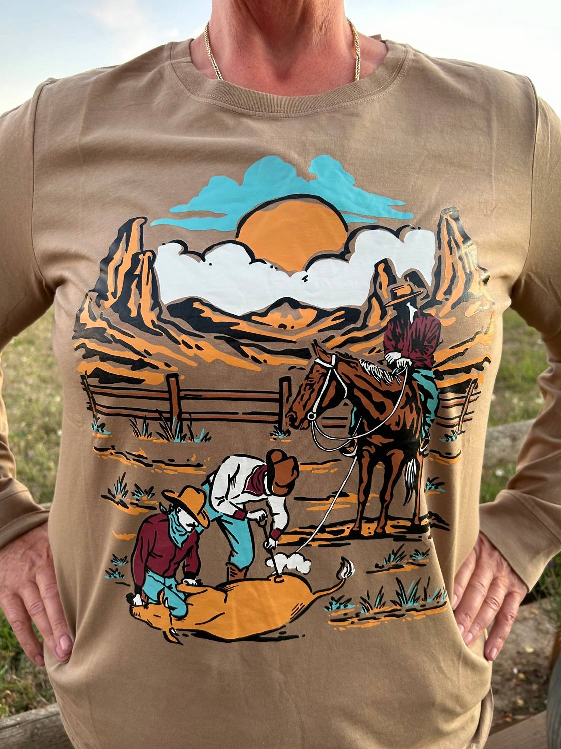 A long sleeve top you can wear with denim, skirts, well... just about anything! Introducing the Women's Branding Day Top by Cruel Girl, a stylish nod to Western flair in a taupe hue. This long sleeve tee, made from soft cotton, features colorful screen-printed graphics that evoke the teamwork between cowboys and horses. Perfect for spring vacations, the top offers a comfortable crewneck design and convenient pull-on closure. Care for this graphic tee is a breeze: simply machine wash and tumble dry.