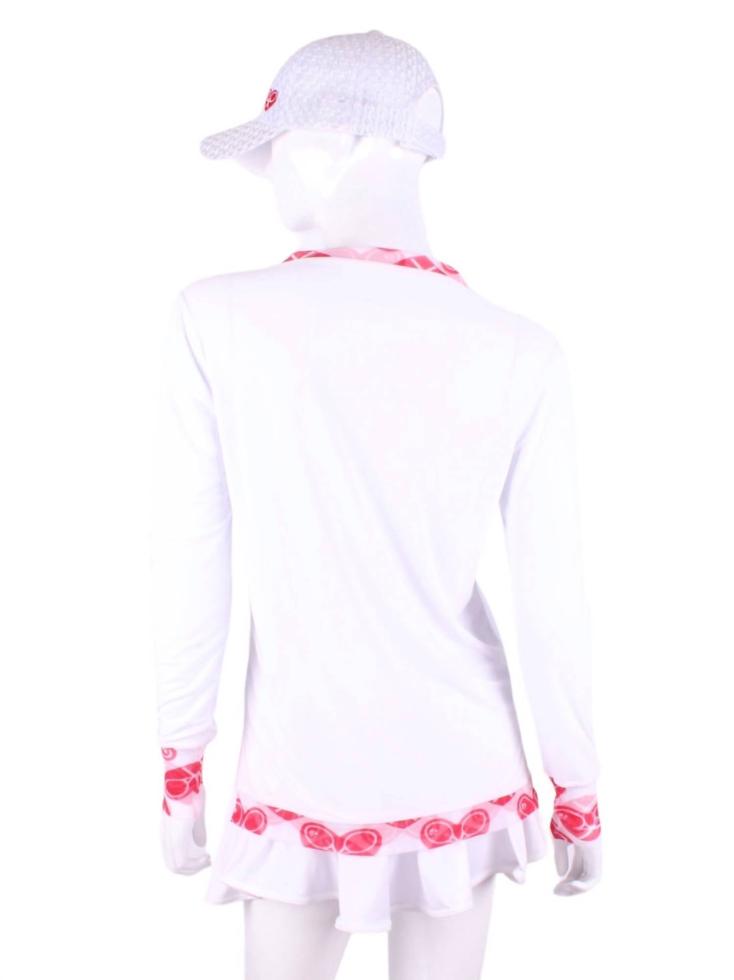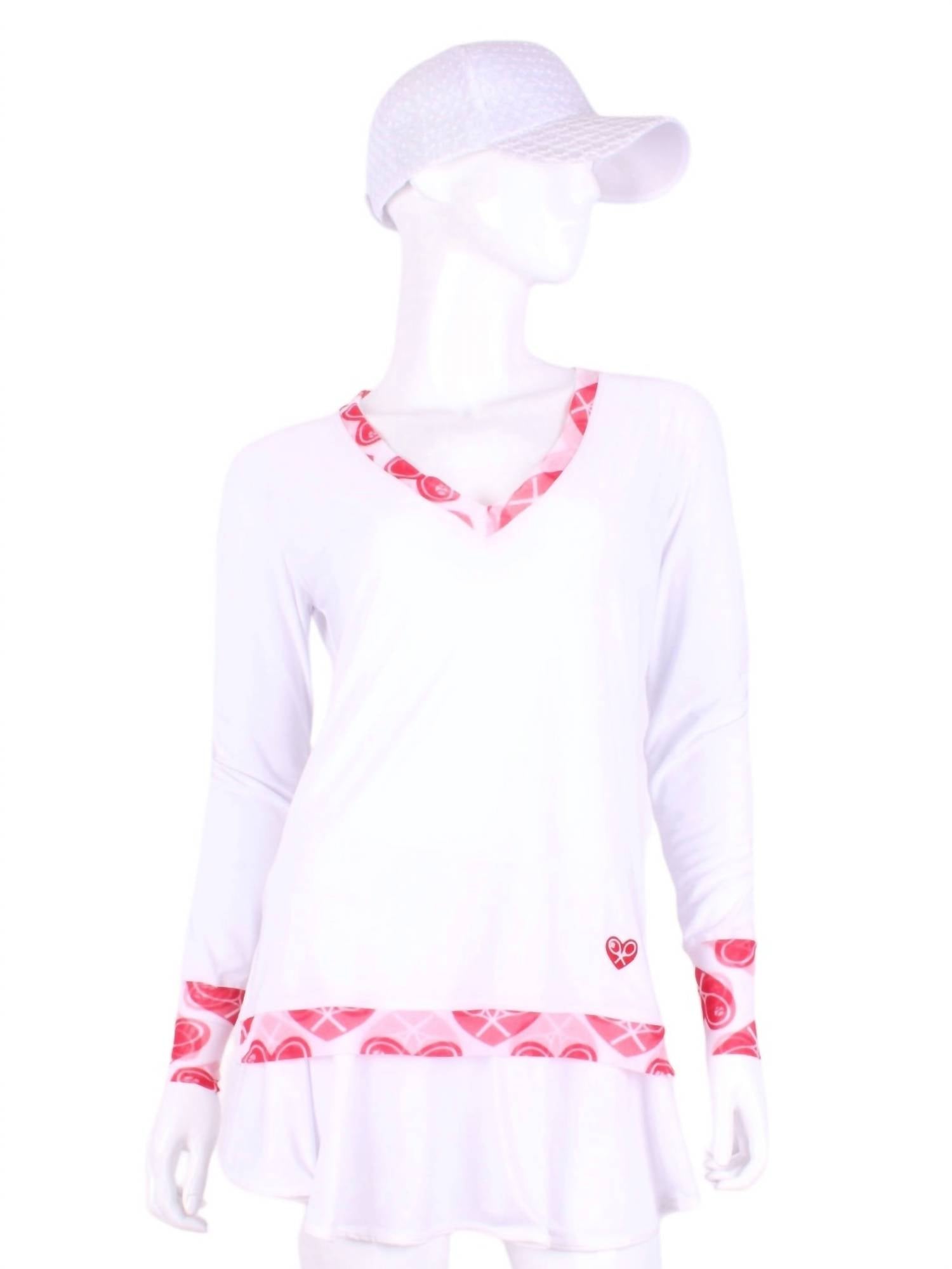 Great fit, cute design, soft fabric. You'll love everything about this long sleeve tee. Introducing the Women's Heart Trim Long Sleeve Very Vee Tee by Love Love Tennis, a perfect blend of sporty elegance and feminine charm. Crafted with long sleeves and a distinct V-neck, this tee makes a stylish athleisure statement for game day. Made with love for women who appreciate effortless style, it features a pull-on closure. Enjoy the trendy patterned design in timeless white, made to enhance your athletic wardrobe.