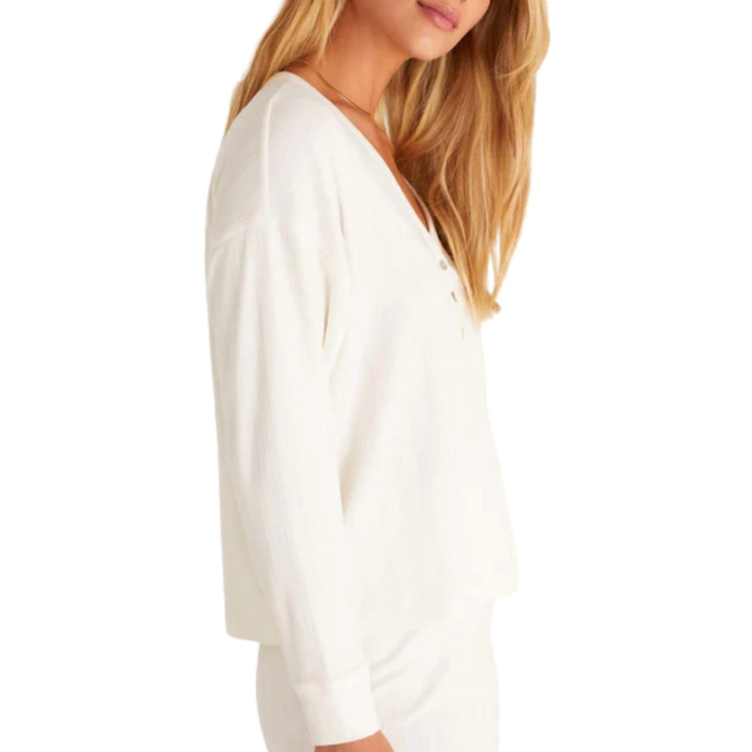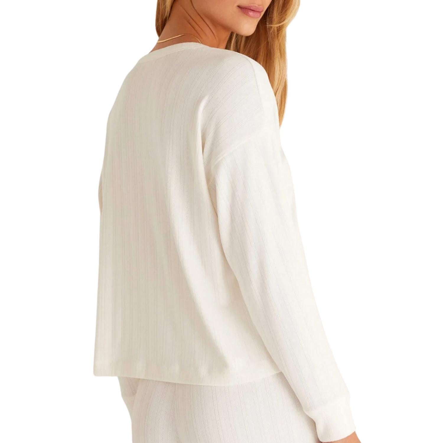 Crafted from silky jersey knit long sleeve top with elegant pointelle details. Featuring a semi-sheer design, a v-neckline with three buttons, drop shoulders, and long sleeves with cuffs. Relaxed fit. Fabric: 95% Polyester, 5% Spandex. Machine wash cold. Size S Measurements - Length 21.2", Bust 42".