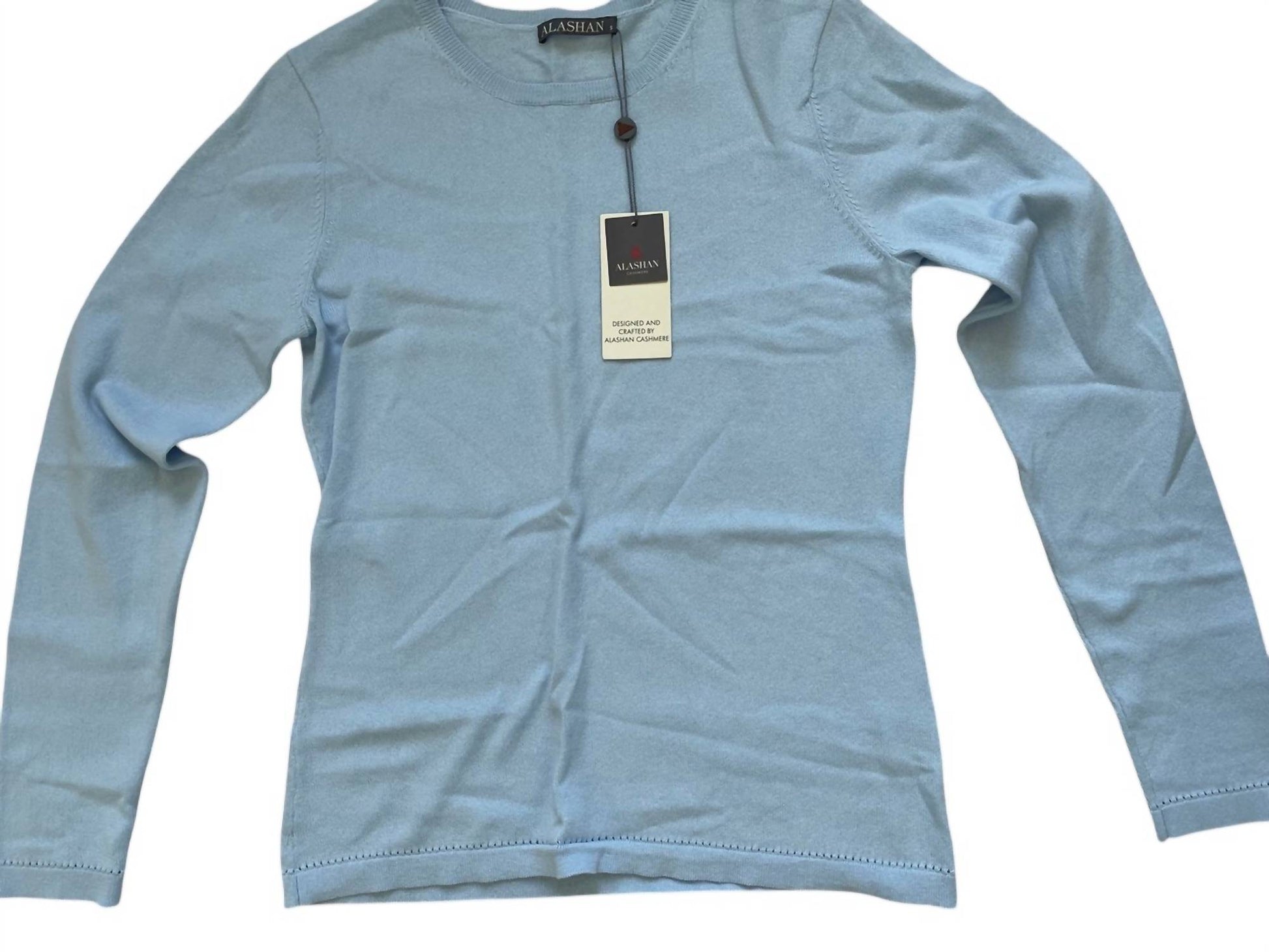 A long sleeve top you can wear with denim, skirts, well... just about anything! Elevate your wardrobe with the Sweater Classic Crewneck Tee by Alashan Cashmere, designed for unmatched softness and style in a dreamy blue hue. Crafted from luxurious cashmere, this tee features a classic crew neckline and long sleeves, making it an elegant choice for various occasions. With a solid pattern and pull-on closure, it effortlessly blends comfort with sophistication.