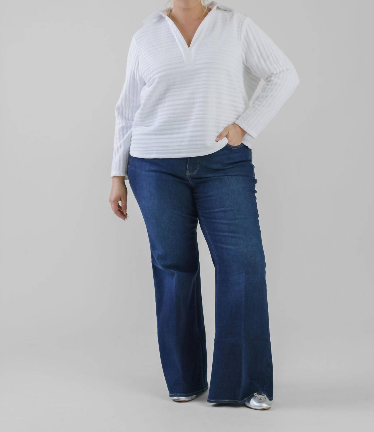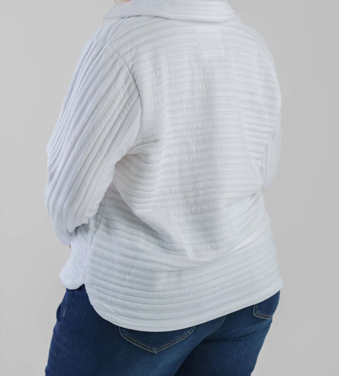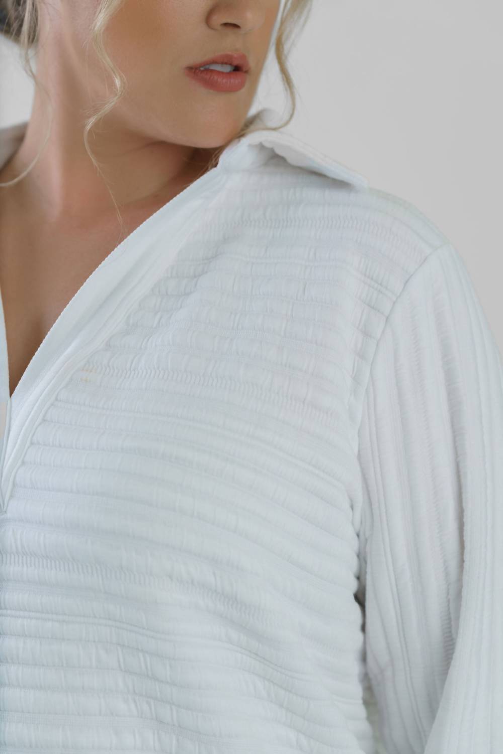 The perfect long sleeve tee that goes with just about anything. Elevate your wardrobe with the Textured Stripe V-neck Polo Top by Nic + Zoe, a staple in chic versatility tailored for plus sizes. Crafted from textured polyester, this long sleeve polo in Paper White features a classic polo collar and a flattering V-neckline. With a split neck design and pull-on closure, it seamlessly blends comfort with style. Care for it by hand washing and laying flat to dry, making it an easy choice for summer workwear and festive occasions alike.