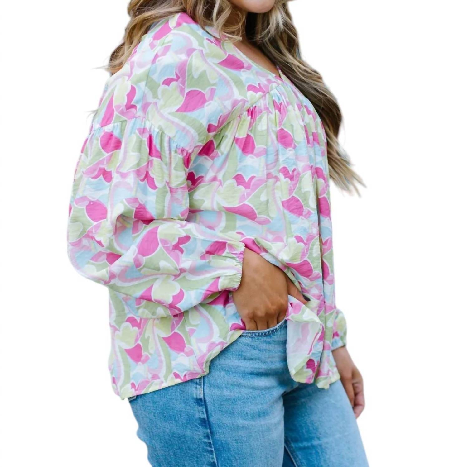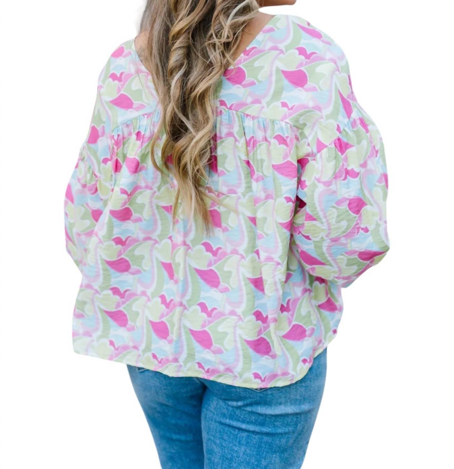 Delightful Come Away with Me Melon shade. Long sleeve top features elegant balloon sleeves and a flowy fit. Crafted from a blend of 80% Rayon and 20% Nylon. Offers a comfortable composition with a garment length of 26". Designed with a V-neckline and a convenient pull-on closure.