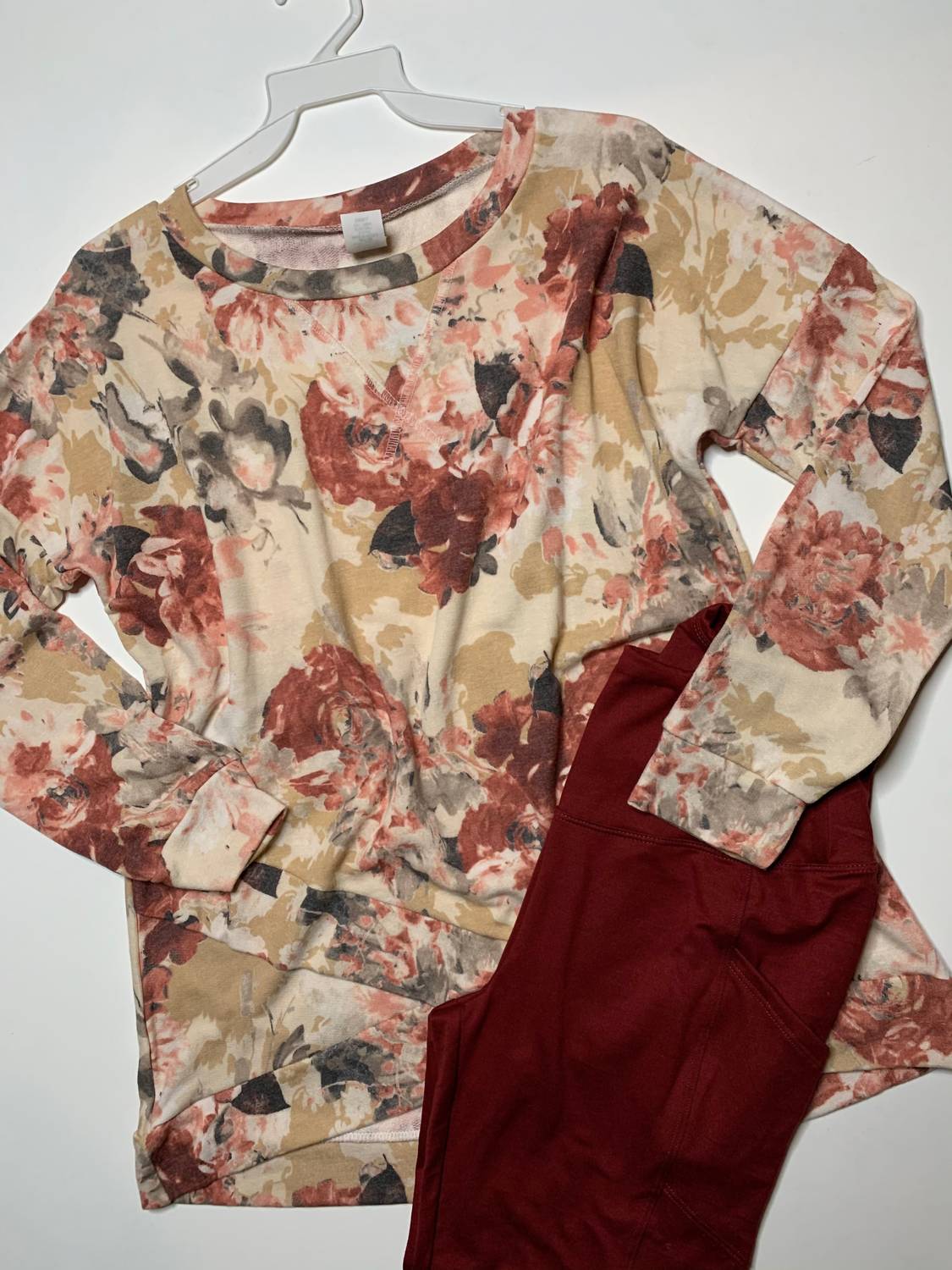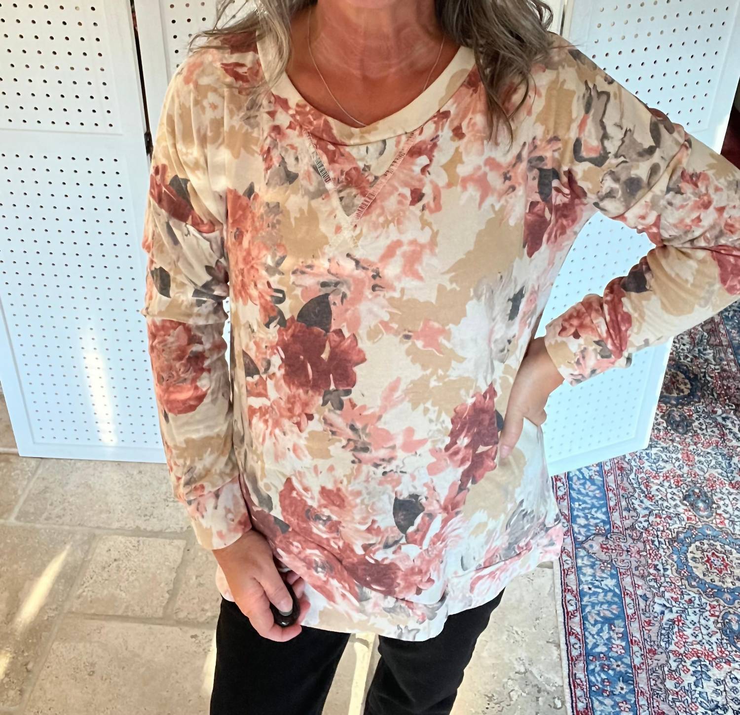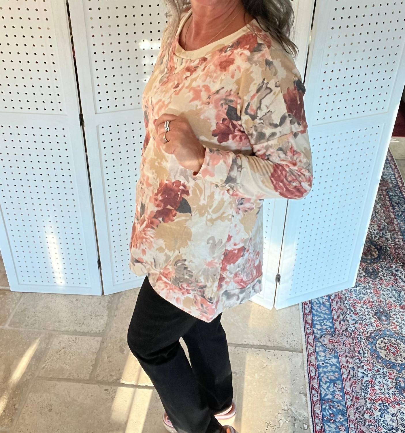 Great fit, cute design, soft fabric. You'll love everything about this long sleeve tee. Introducing the Vintage Tapestry Weekender Top by Sew In Love, a beautifully crafted piece in watercolor tones. This long sleeve tee is made from a soft and stretchy French Terry blend of 63% Polyester, 34% Rayon, and 3% Spandex, featuring a flattering cross-over hemline perfect for pairing with leggings. The pull-on design complements the comfortable crewneck, while the floral pattern adds a touch of elegance. Available in sizes from Small to 3X, ensuring a true-to-size fit for every wearer.