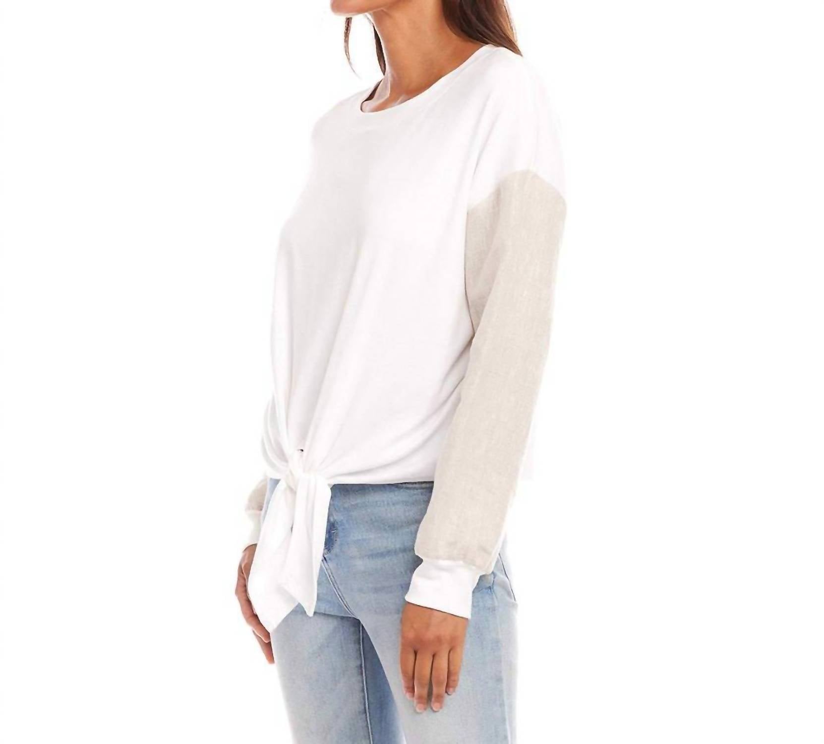 Great fit, cute design, soft fabric. You'll love everything about this long sleeve tee. Step into sustainable style with the Contrast Tie-Front Top by Karen Kane, a chic addition in Off White with Oat. This top boasts long sleeves crafted from 100% linen and a crew neck design, offering a unique mix of textures. Composition includes 58% Hemp, 38% Organic Cotton, and 4% Spandex, with a convenient pull-on closure. Made in the USA, it ensures both quality and sustainability, with a care recommendation of dry clean only and a length of 21 1/8 inches for size M.