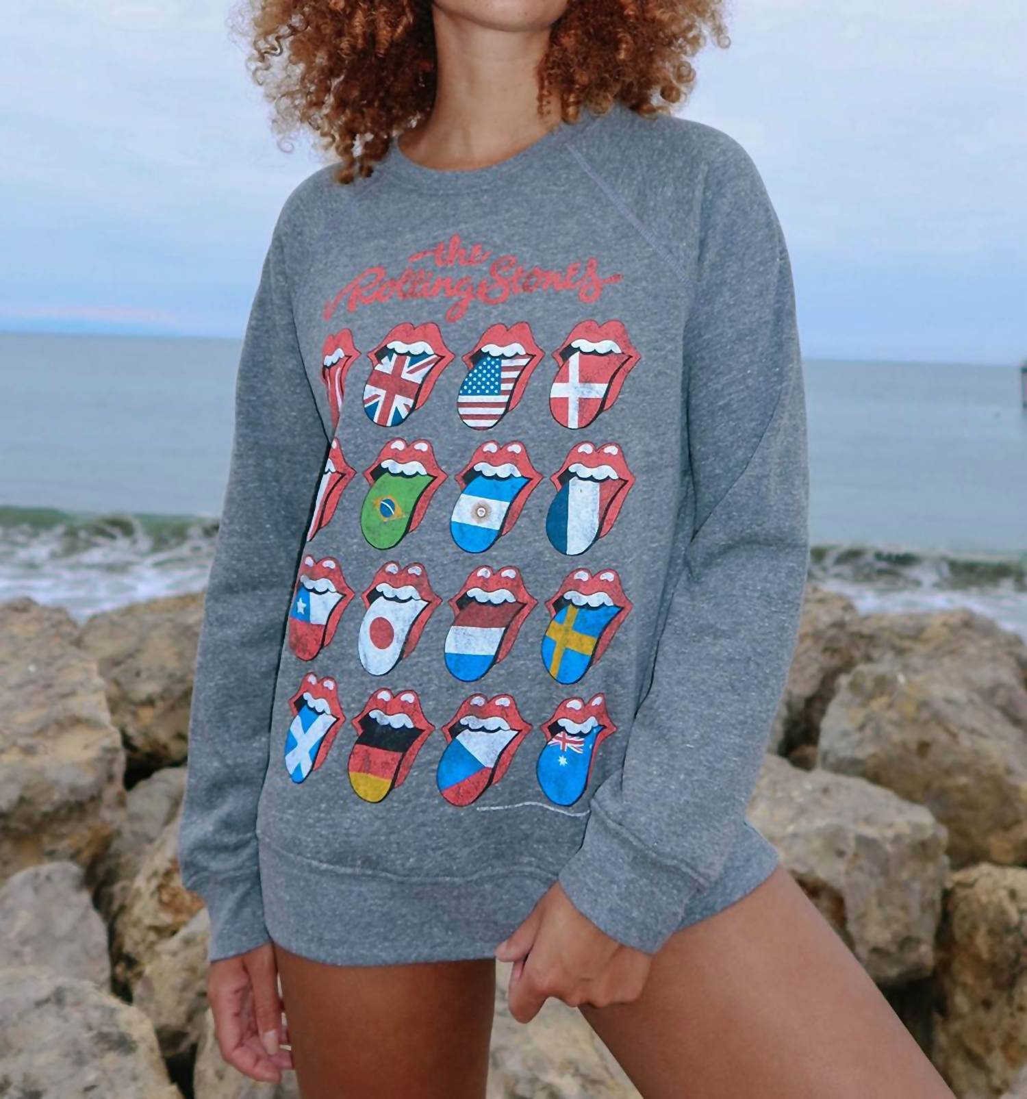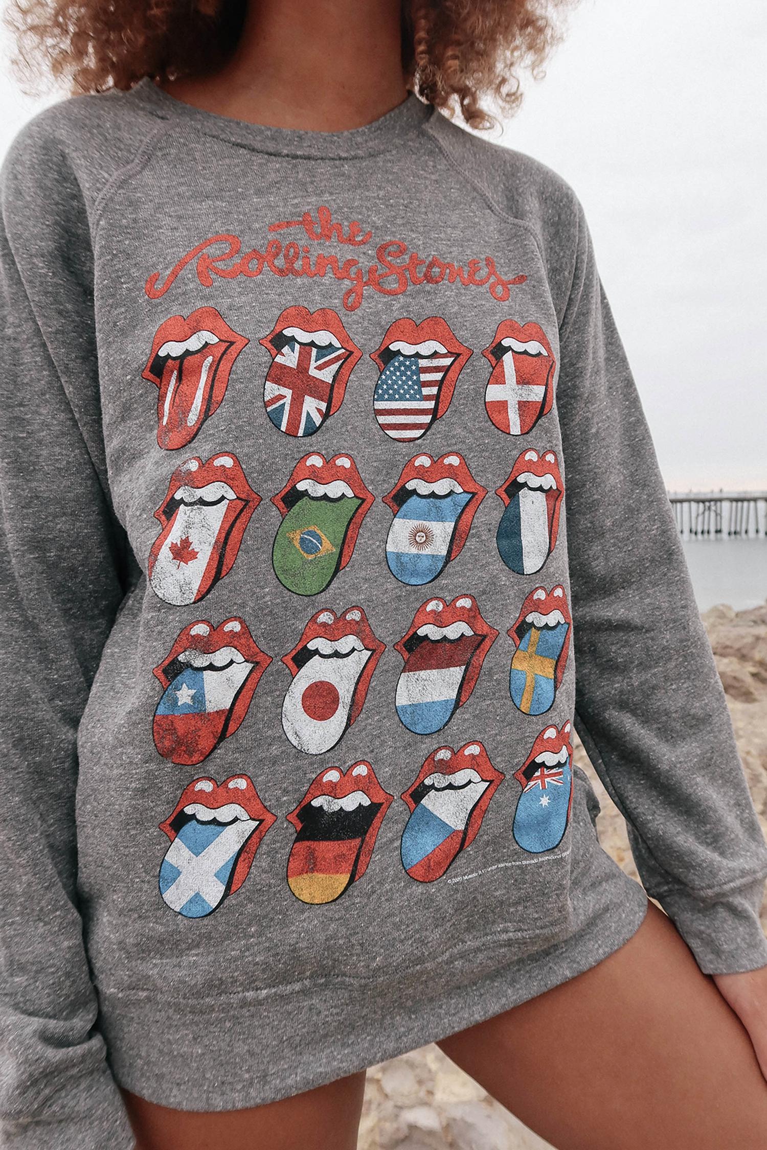 A long sleeve top you can wear with denim, skirts, well... just about anything! Elevate your style with the Rolling Stones World Tour Fleece Sweatshirt by People of Leisure, a must-have for any fan. This long sleeve, heather gray sweatshirt showcases the iconic Stones' logo with various country flags, adding a vibrant graphic touch. Crafted from 50% organic cotton and 50% recycled cotton, it is ethically made in Los Angeles, CA and features a comfortable pull-on closure. For care, simply machine wash cold or warm and tumble dry on low. Available in sizes XS-XL.