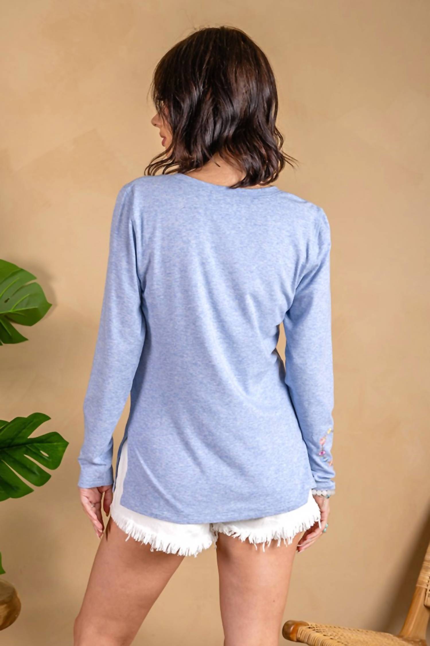 A long sleeve top you can wear with denim, skirts, well... just about anything! Introducing the Embroidered Jersey Long Sleeve Tee by PAPARAZZI, a delightful addition to your wardrobe with a chic floral heart motif. This women's top combines a soft cotton blend of 70% Cotton, 25% Polyester, and 5% Spandex, offering lightweight comfort and style. Available in a stunning blue color, it features a classic crewneck design. With a convenient pull-on closure, it's perfect for casual days and can be easily maintained with machine wash care.