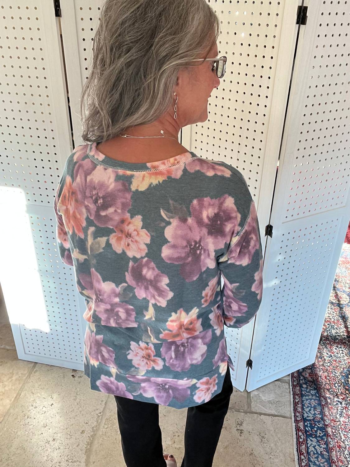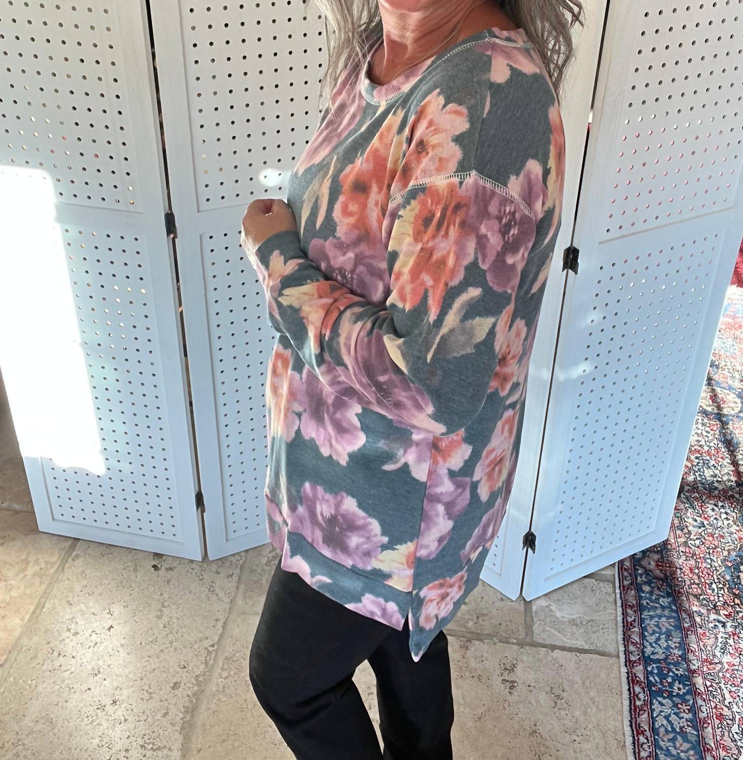 The perfect long sleeve tee that goes with just about anything. Introducing the Scattered Blooms Hi-Lo Crew Neck Top by Sew In Love, a delightful addition to your wardrobe in a charming Grey/Multi floral pattern. Crafted from French Terry fabric composed of 63% Polyester, 34% Rayon, and 5% Spandex, this top promises softness and a comfortable stretch. It features long cuffed sleeves and a tunic-length straight cut with a hi-lo hemline, showcasing side slits with a 1 1/2" difference for added flair. The pull-on design makes it easy to pair over leggings for a flattering look, with sizes ranging from Small to 3X.