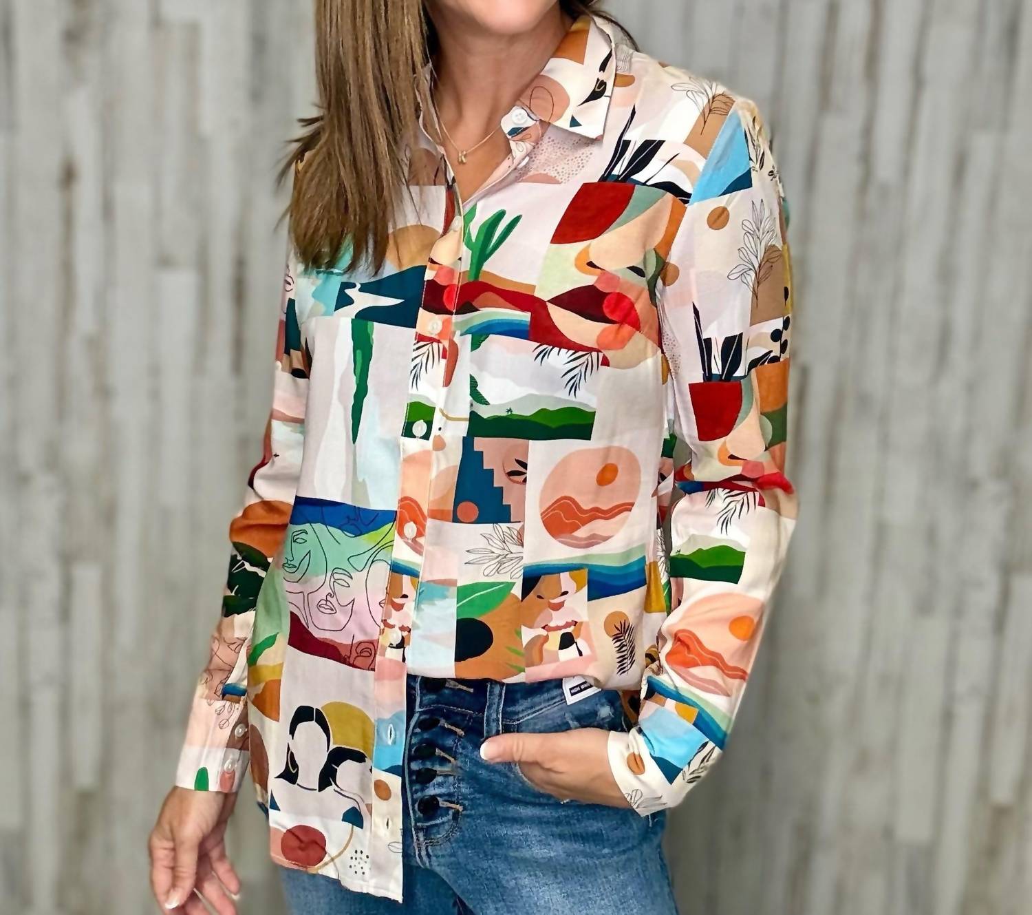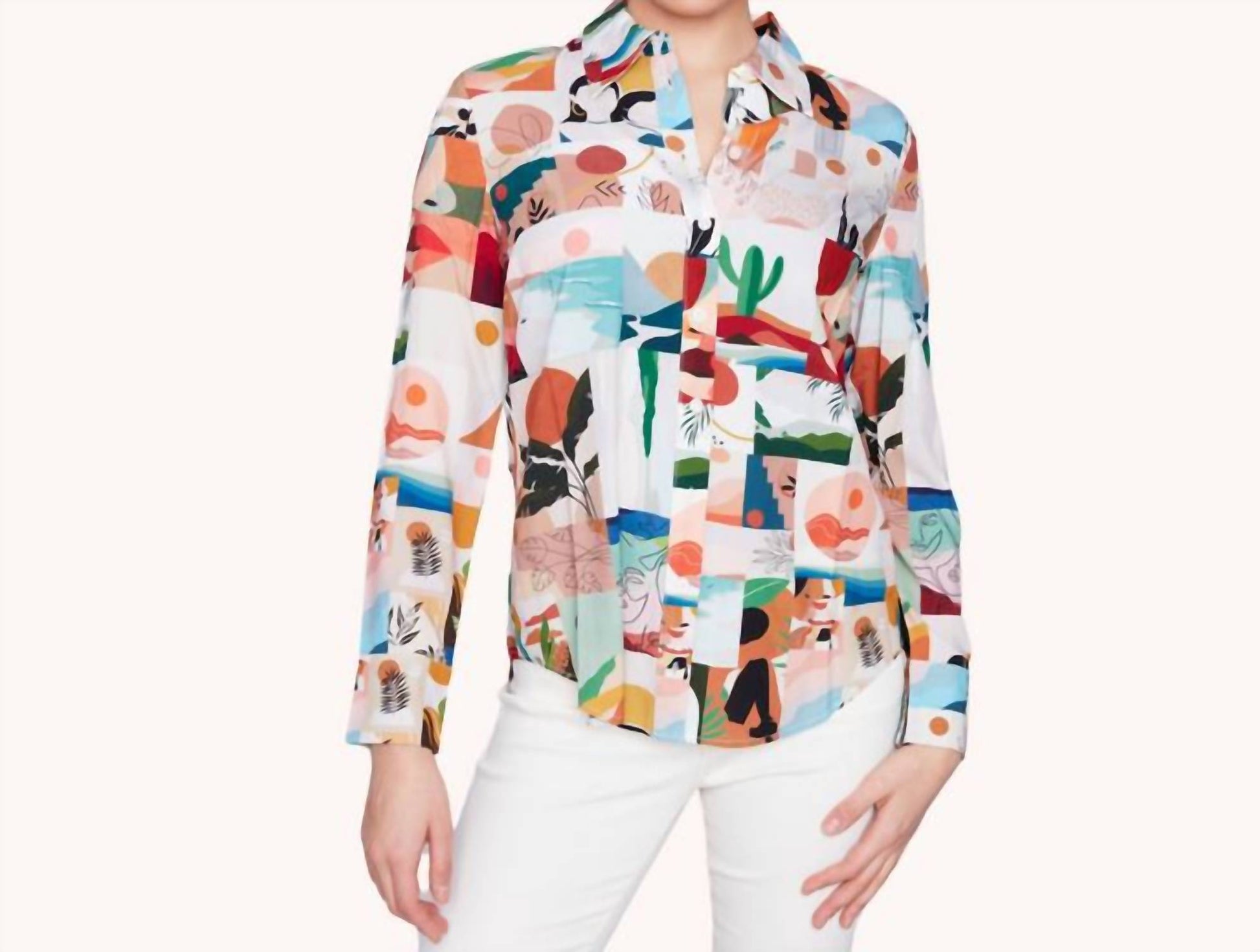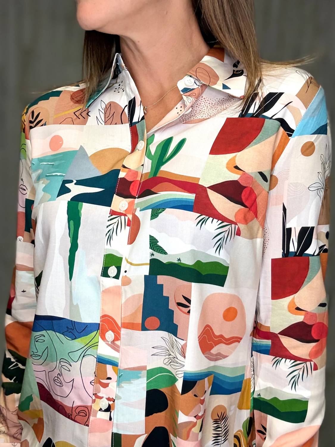 Great fit, cute design, soft fabric. You'll love everything about this long sleeve tee. Showcase your unique style with the Corner Of Winslow Arizona Top by CHARLIE B, featuring a captivating multi-pattern on a white backdrop. This long-sleeve blouse is crafted from 100% Viscose, ensuring a flowy and airy feel. It includes a button closure and classic shirt collar, perfect for wearing solo or layering. Care for this garment by hand washing in cold water, hang drying, and ironing on low for lasting quality.