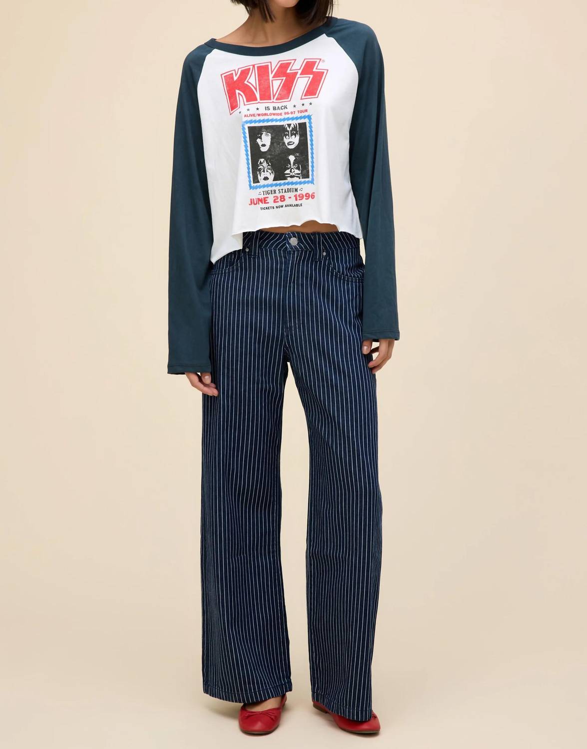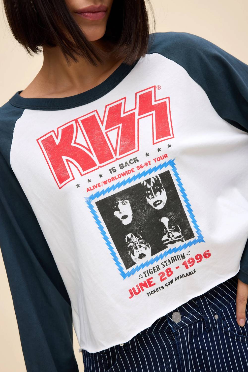 A long sleeve top you can wear with denim, skirts, well... just about anything! Rock nostalgia with the DAYDREAMER Kiss Tiger Stadium Raglan Long Sleeve Tee, perfect for capturing 90s fashion energy. Featuring a vibrant graphic pattern in Americana colors, this tee is the ultimate tribute to Kiss's legendary Alive/Worldwide Tour. Made from soft cotton, it offers a classic crewneck design, ideal for a vintage-inspired look. Closure is pull-on for easy wear. This piece is perfect for spring holiday parties and celebrating Thanksgiving in style.