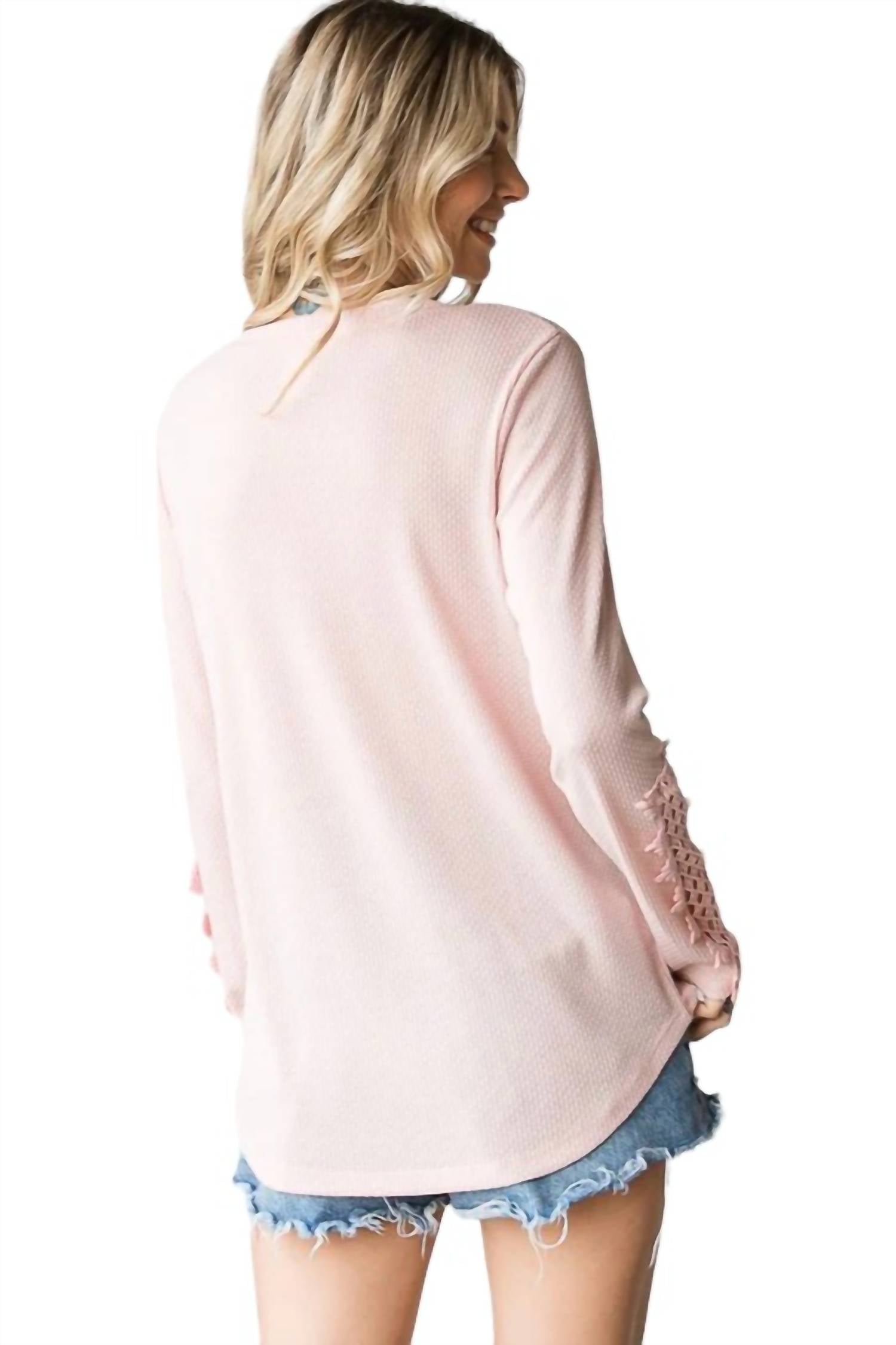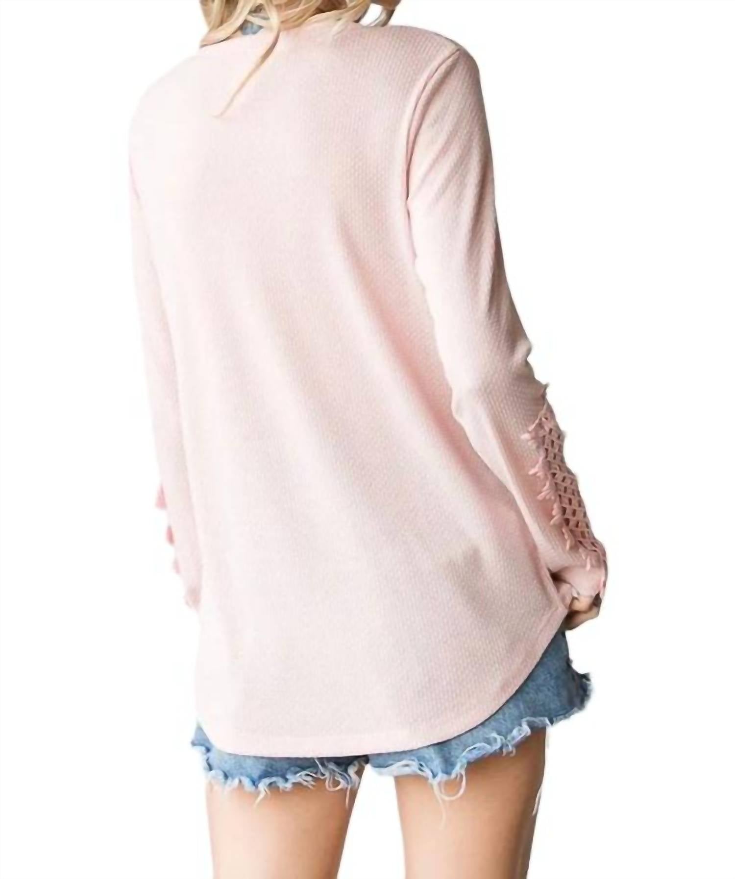 Effortless elegance in pastel pink. Stunning long sleeve tee. Crafted from a luxurious blend of polyester, rayon, and spandex. Offers a soft, comfortable fit. Delicate lace trim on the sleeves. Transforming a simple design into a sophisticated statement piece. Round neck and curved hemline ensure a flattering cut. Practical yet stylish. Blending comfort and style effortlessly.