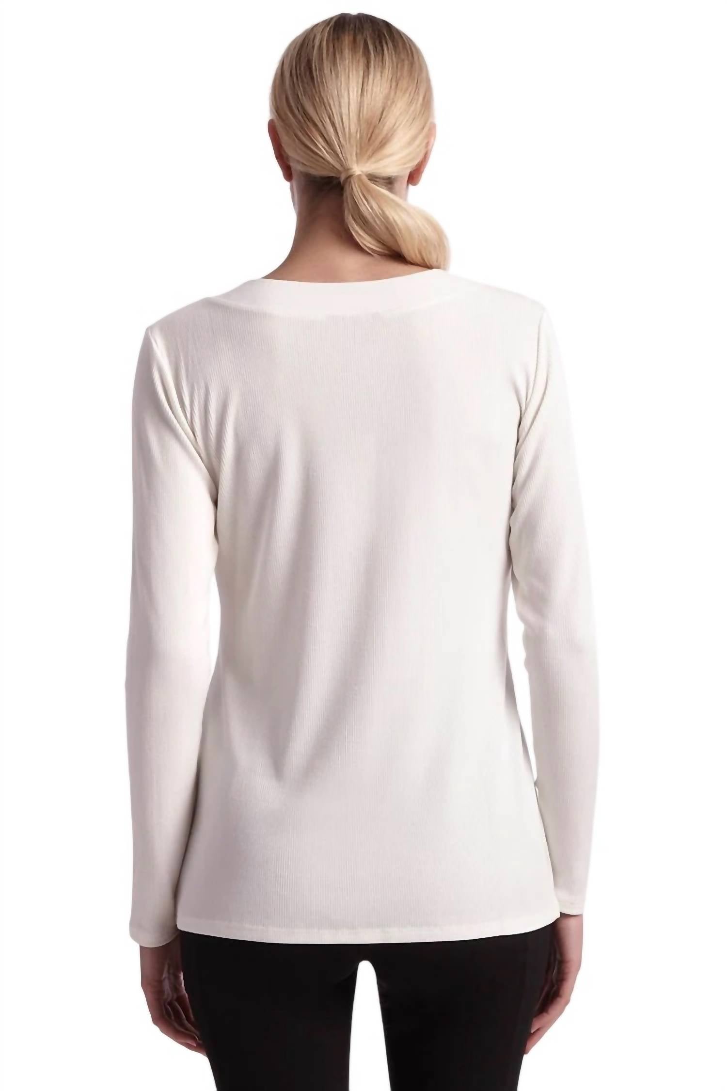 V-neck tee shirt. 94% Polyester, 6% Spandex. Machine Wash Cold, Do Not Bleach, Lay Flat To Dry, Cool Iron If Needed, Or Dry Clean. Imported. Textured knit construction. Long sleeves. Straight hemline. Pull-on style.