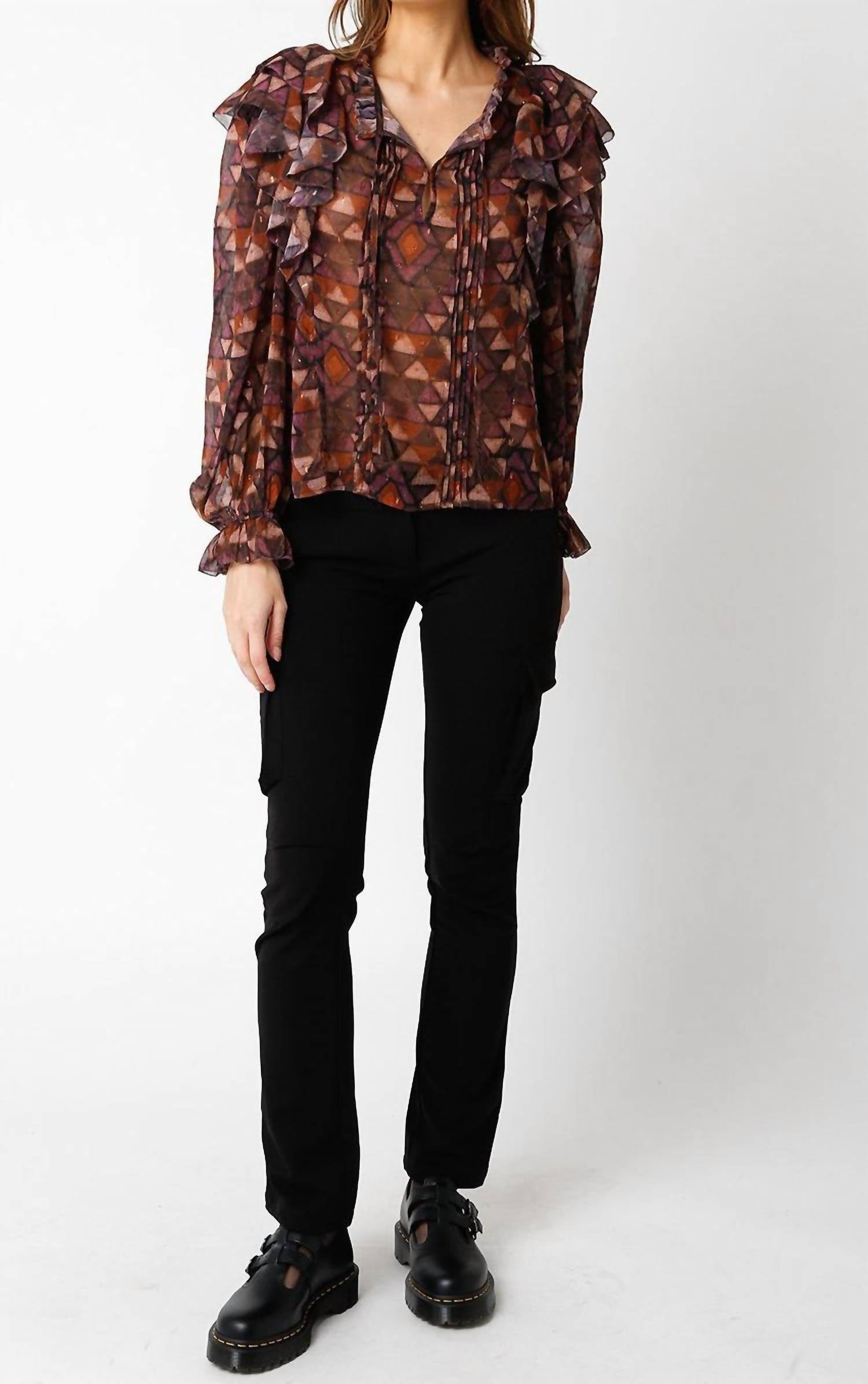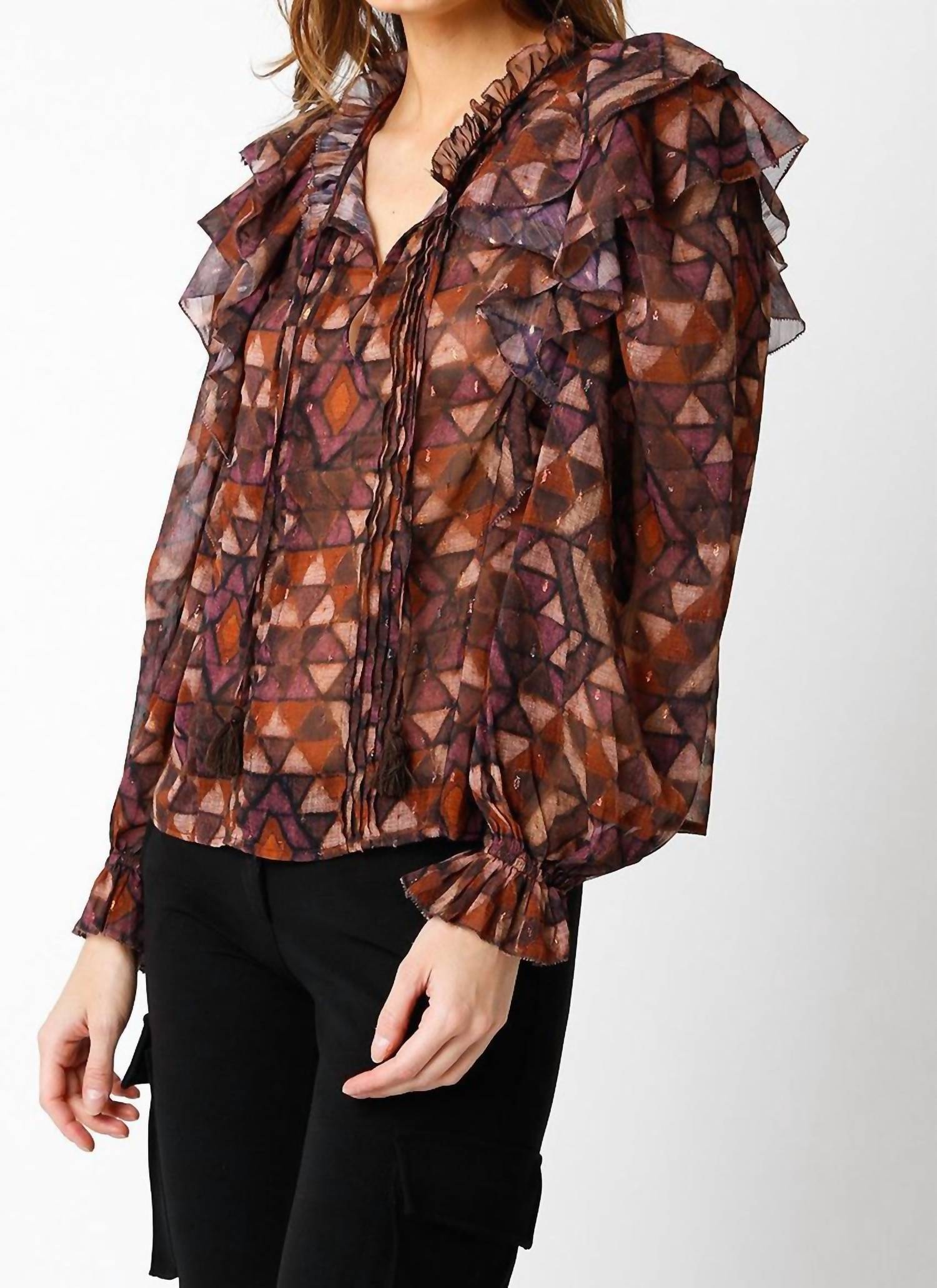 A long sleeve top you can wear with denim, skirts, well... just about anything! Discover the Adalyn Top by OLIVACEOUS, a striking multi-patterned piece that adds flair to any wardrobe. This women's top combines a sophisticated v-neckline with fashionable puff long sleeves for a bold statement. Composition: 100% Polyester. Closure: Pull on. Care: Machine wash on low, delicate cycle and lay flat to dry or opt for dry cleaning if preferred.