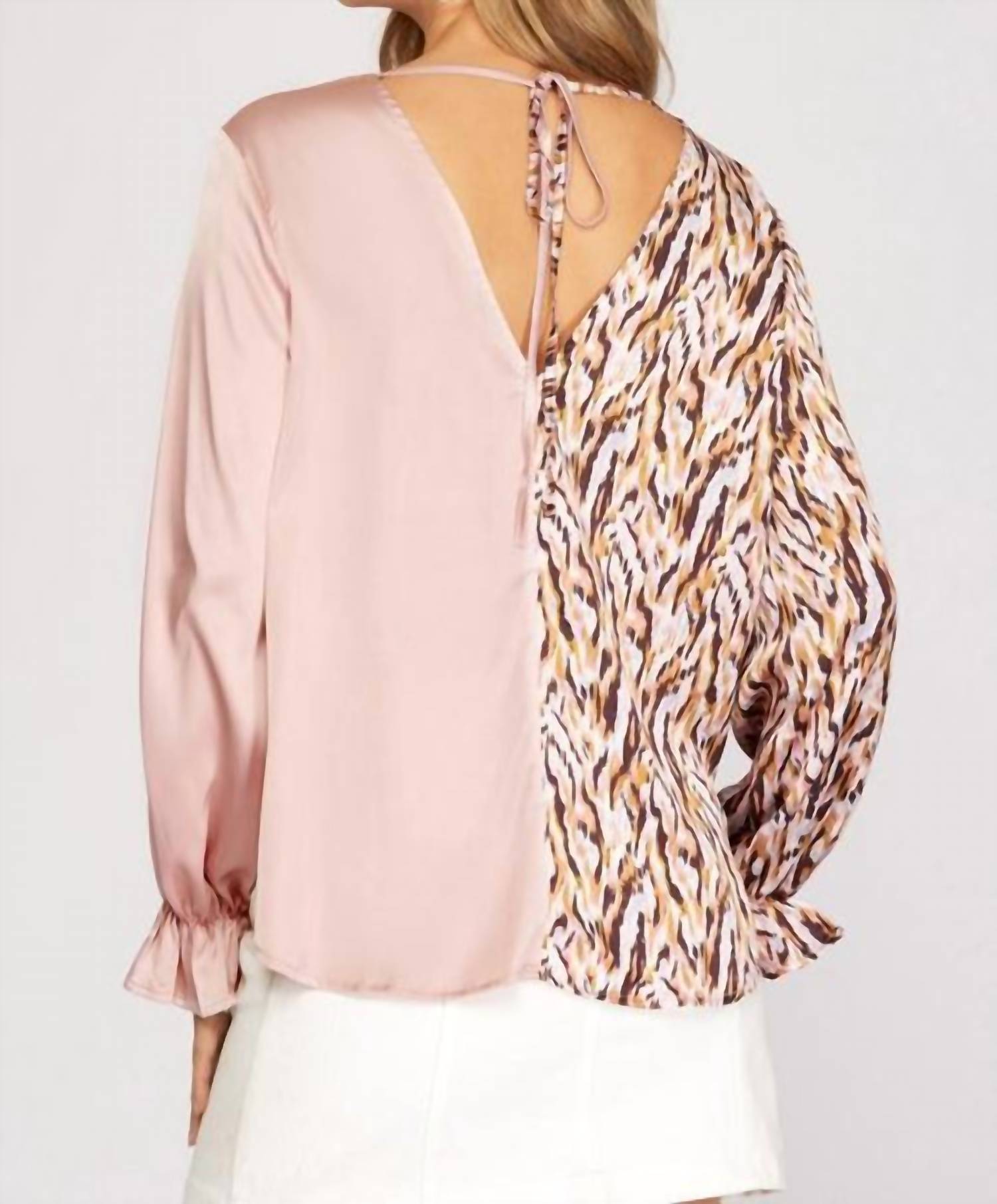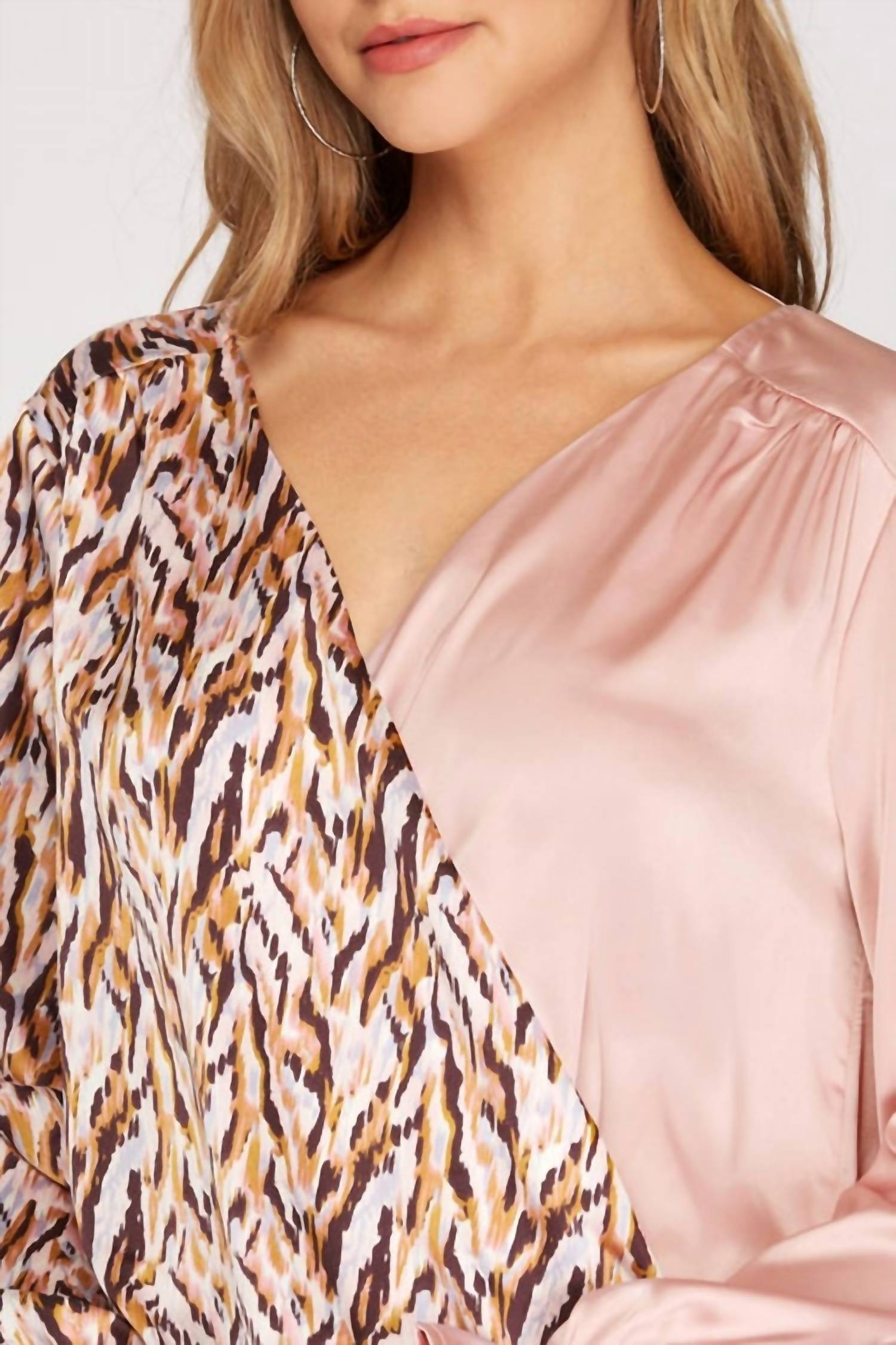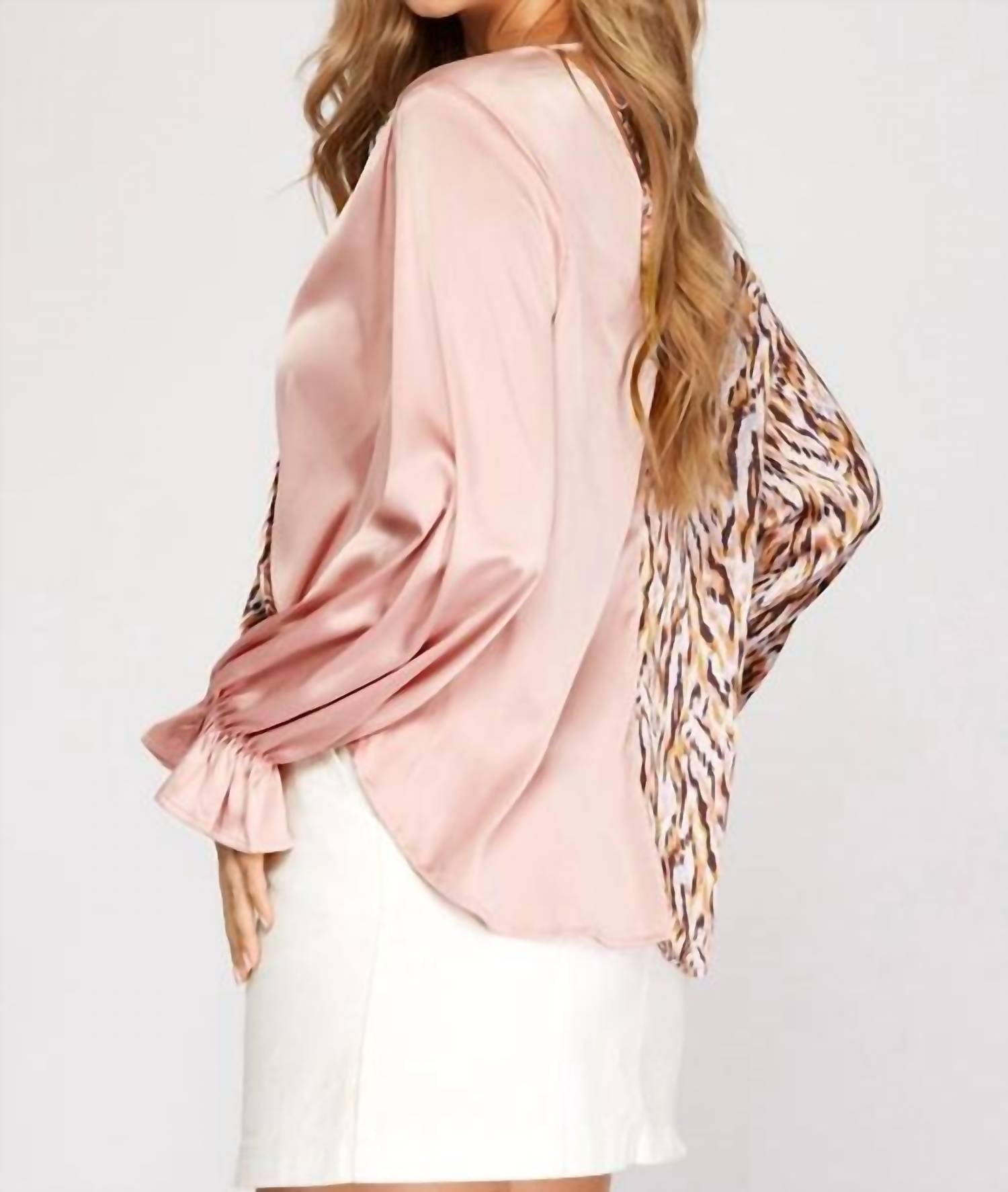 This satin top is so cute with abstract print on one side and soft blush on the other. Runs true to size, blousy look.