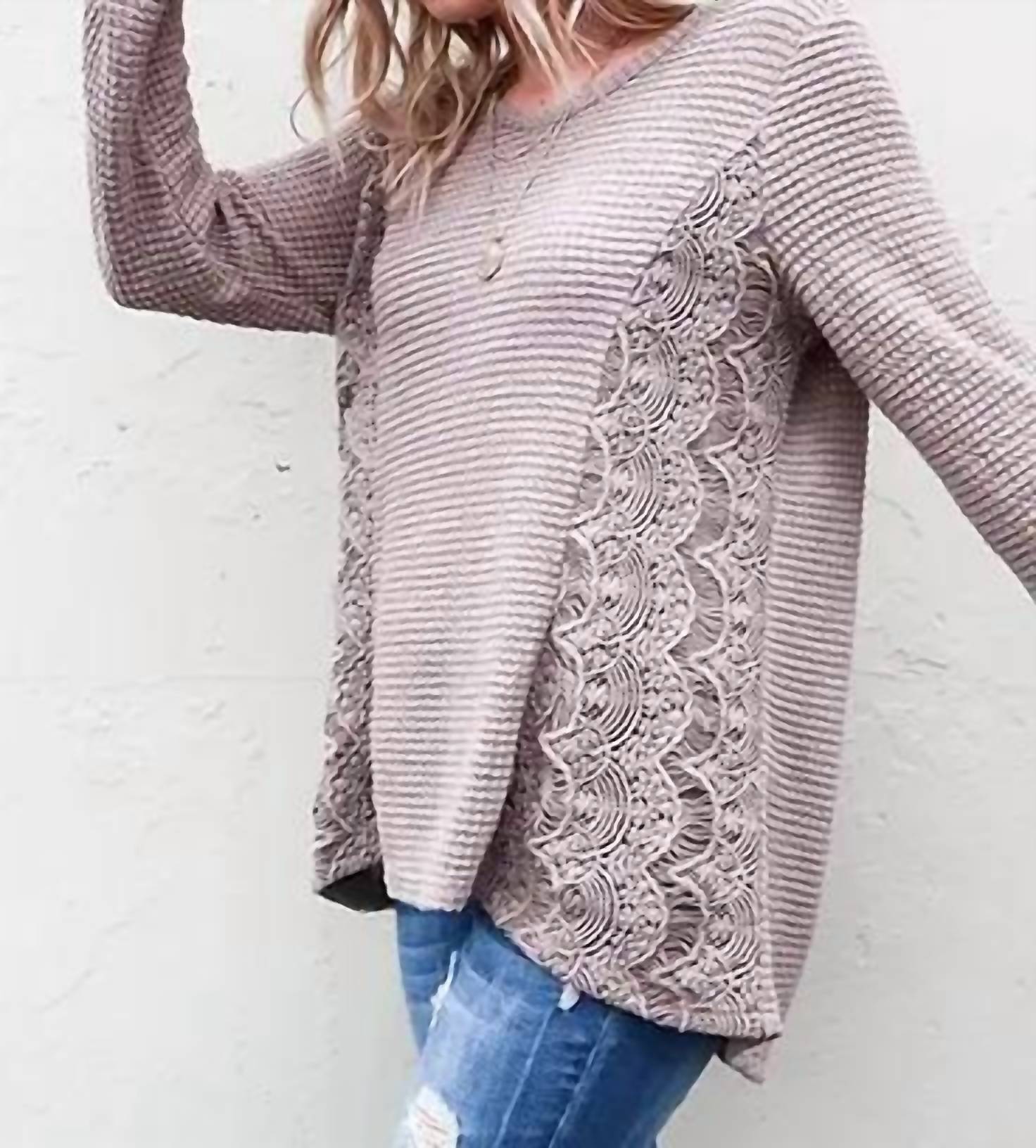 The perfect long sleeve tee that goes with just about anything. Embrace effortless style with the And The Why Waffle Side Lace Top in a chic taupe hue. This women’s top features long sleeves and a solid pattern, complemented by a classic crewneck for a timeless silhouette. The pull-on closure ensures ease and comfort for everyday wear. Perfect for layering or wearing on its own, this piece is a versatile addition to any wardrobe.