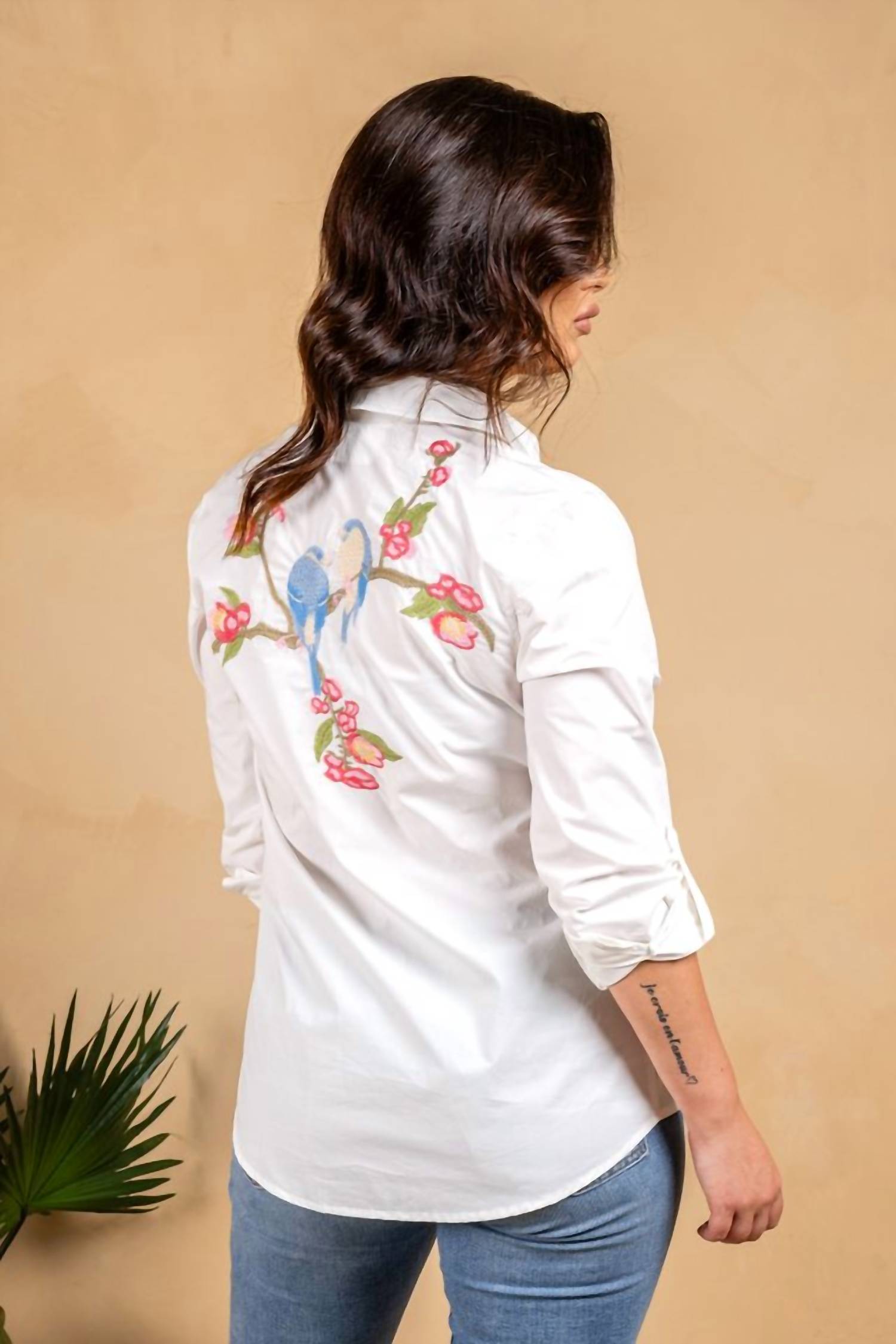 Great fit, cute design, soft fabric. You'll love everything about this long sleeve tee. A crisp poplin shirt featuring a button front with a classic collar and long sleeves with button cuffs. Detailed with bird embroidery on the front and back for a unique touch. Designed with a straight front hem and a longer, curved back for added style and coverage. Care for this garment is simple with machine wash and lay flat to dry.