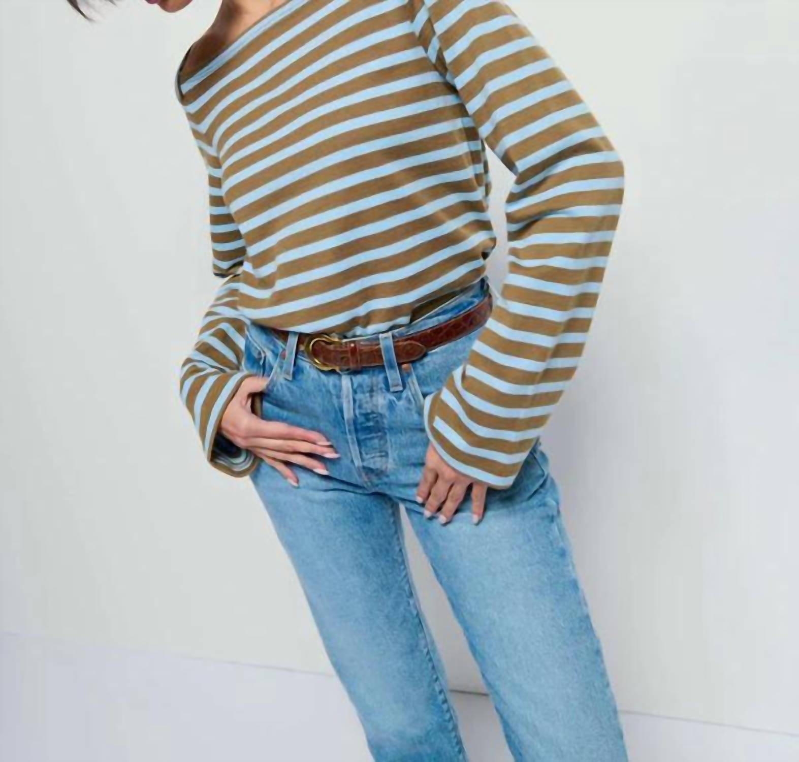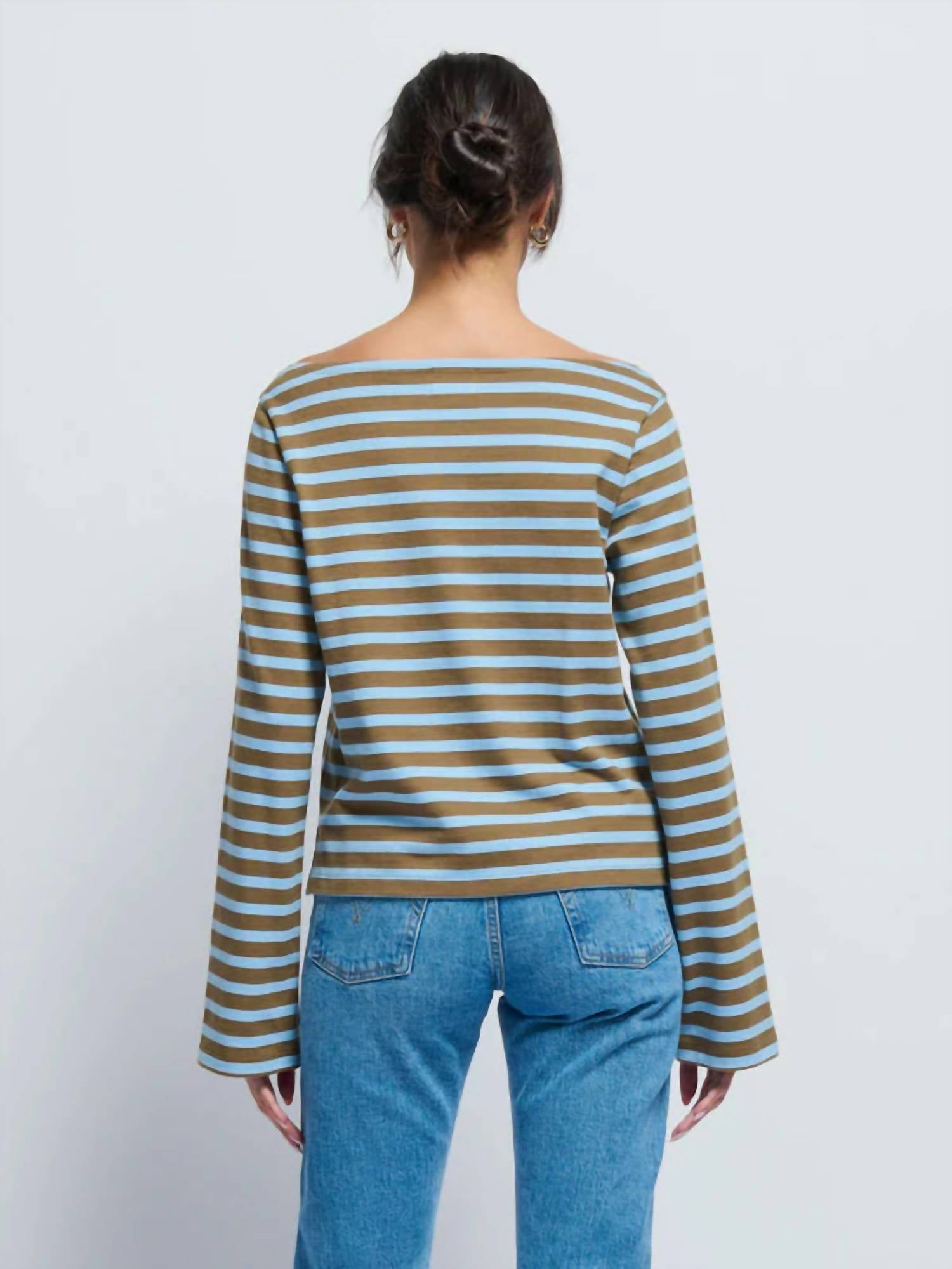 A long sleeve top you can wear with denim, skirts, well... just about anything! Introducing the Bryce Boat Neck Stripe Top by Nation LTD, a chic update to your casual wear with its stylish light blue stripe pattern. This women's top features elegant long bell sleeves, a boatneck, and side slits for a relaxed fit. Crafted from 100% Peruvian cotton, this top is designed with comfort in mind. Closure: Pull on. Care: Machine wash, line dry.