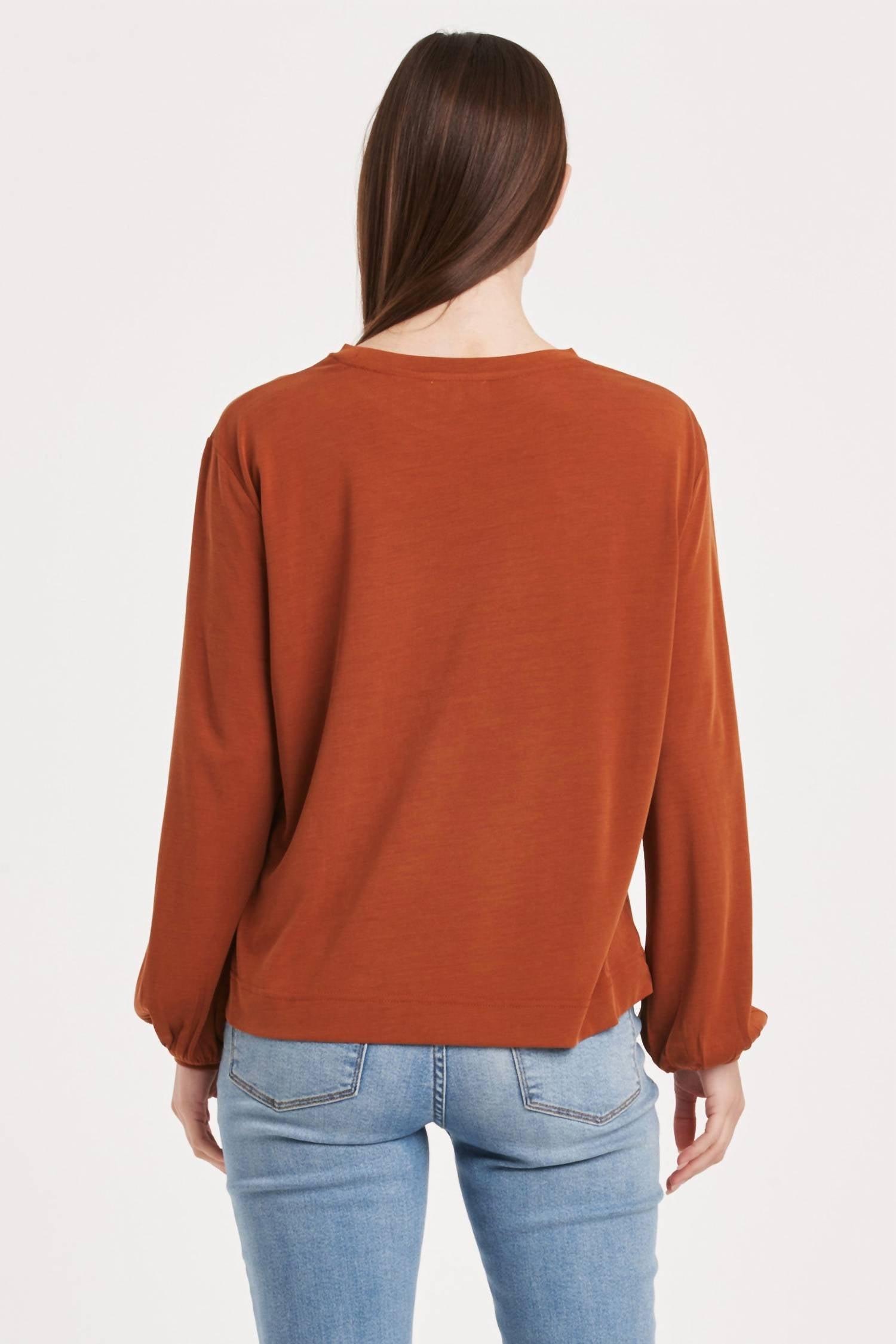 Great fit, cute design, soft fabric. You'll love everything about this long sleeve tee. Elevate your casual wardrobe with the Matilda Crew Neck Top by Another Love, a perfect blend of comfort and style in a warm Roasted Pecan hue. This minimalist staple features long sleeves and a relaxed fit, ideal for vacation wear. Crafted from a blend of 65% Modal and 35% Polyester, it offers a soft touch and easy maintenance. Closure: Pull On. Care: Machine wash and tumble dry.