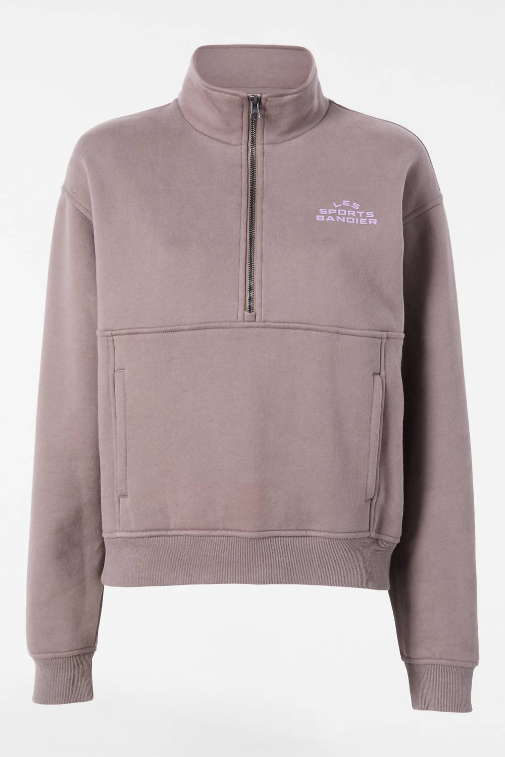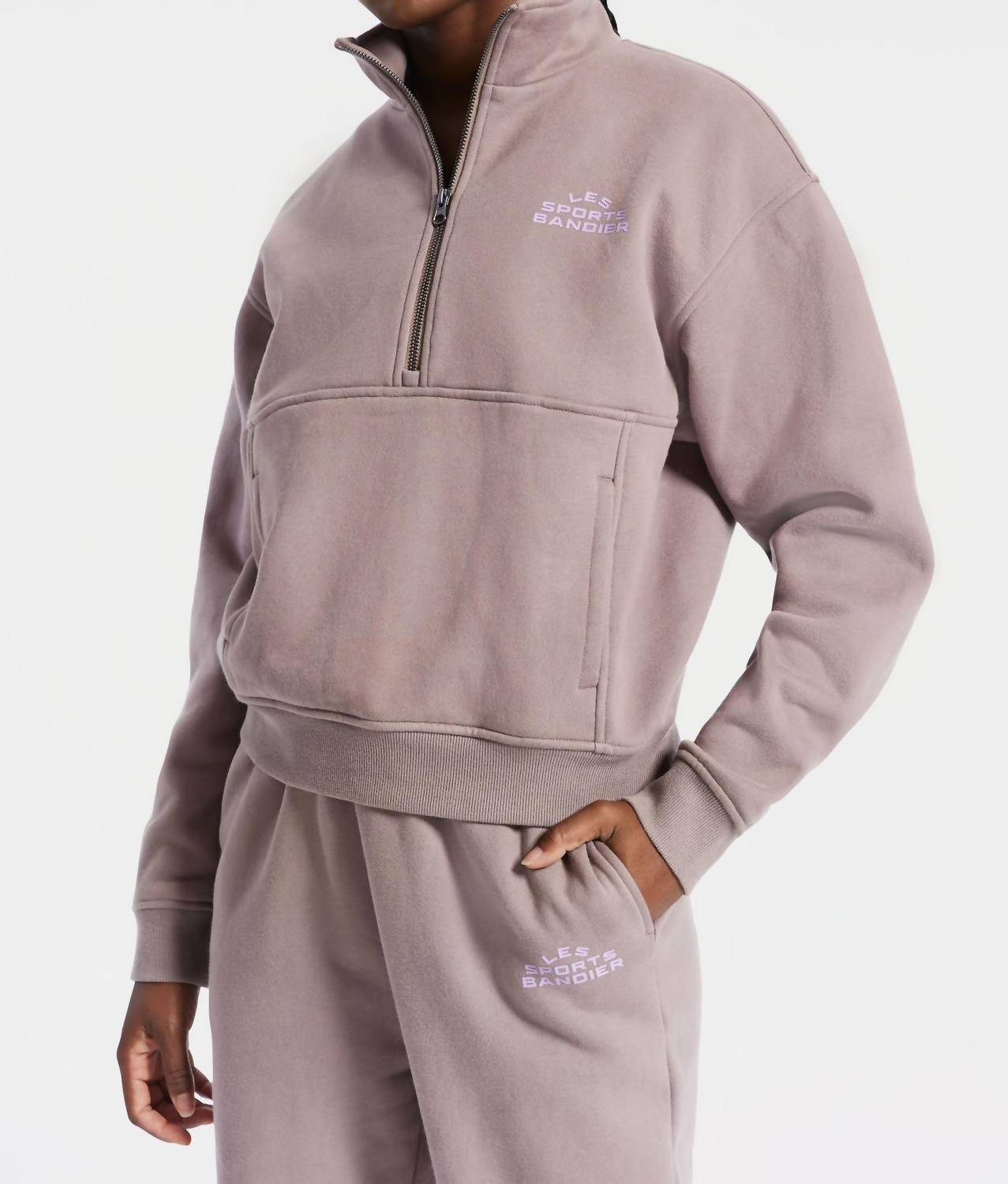 Great fit, cute design, soft fabric. You'll love everything about this long sleeve tee. Embrace comfort and style with the Les Sports Bandier 1/2 Zip Sweatshirt by BANDIER, perfect for your athleisure wardrobe. This long sleeve top, made from 88% cotton and 12% recycled polyester, offers a relaxed fit and mid-weight feel. Its mock neck and convenient ½ zip closure, complemented by ribbed cuffs and hem, ensure a cozy yet fashionable look. Care instructions: machine wash warm and tumble dry low. Available in a chic Iron/Regal Orchid color, it features a French logo detail for added flair.