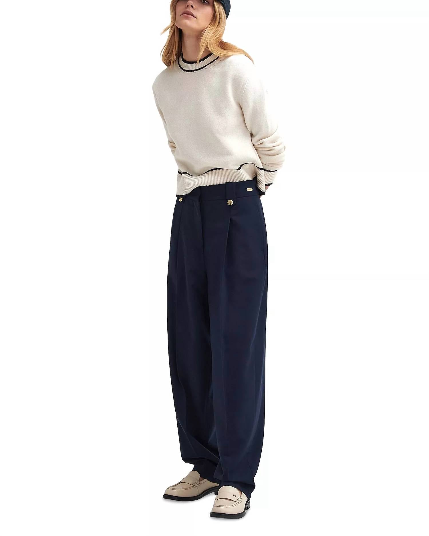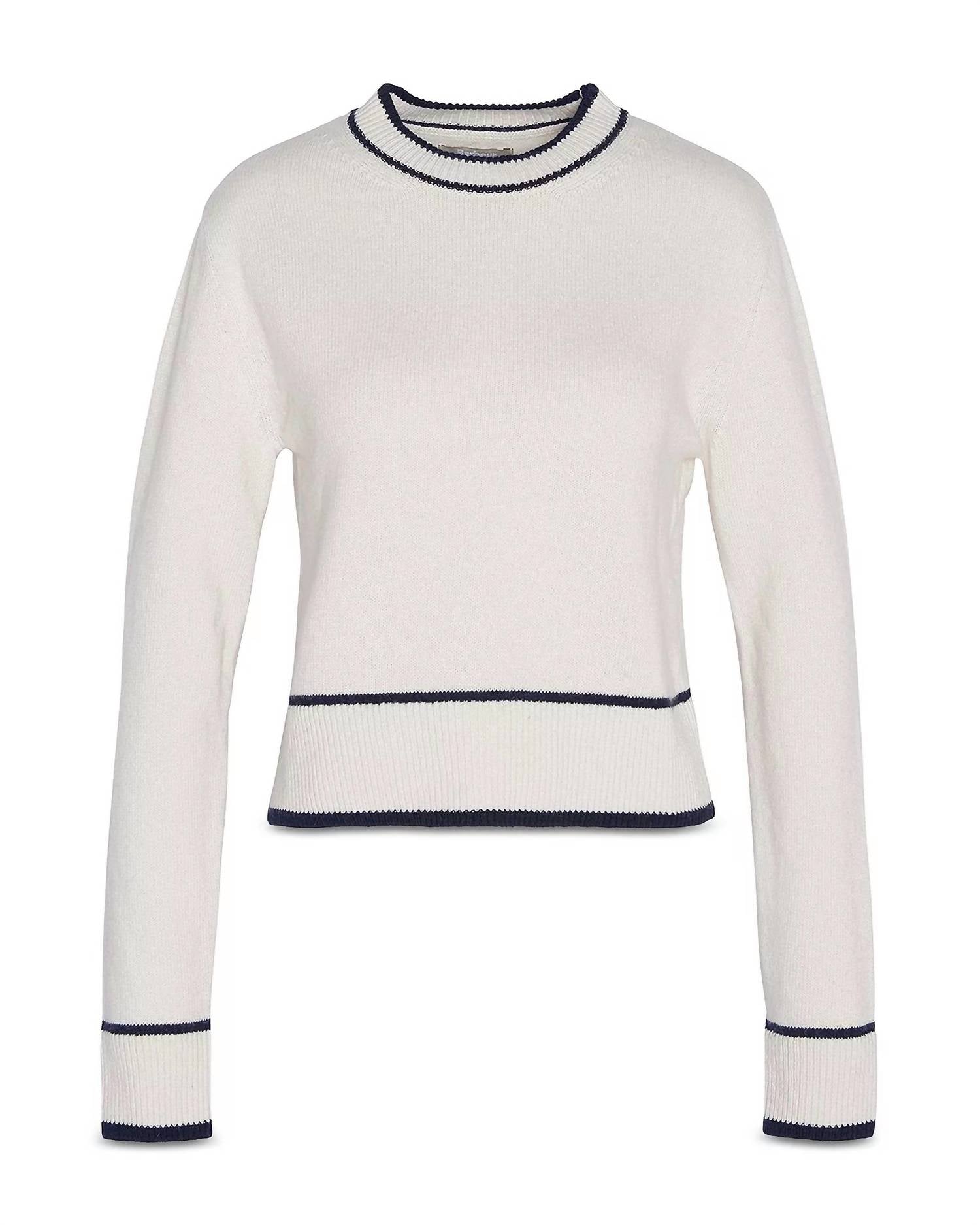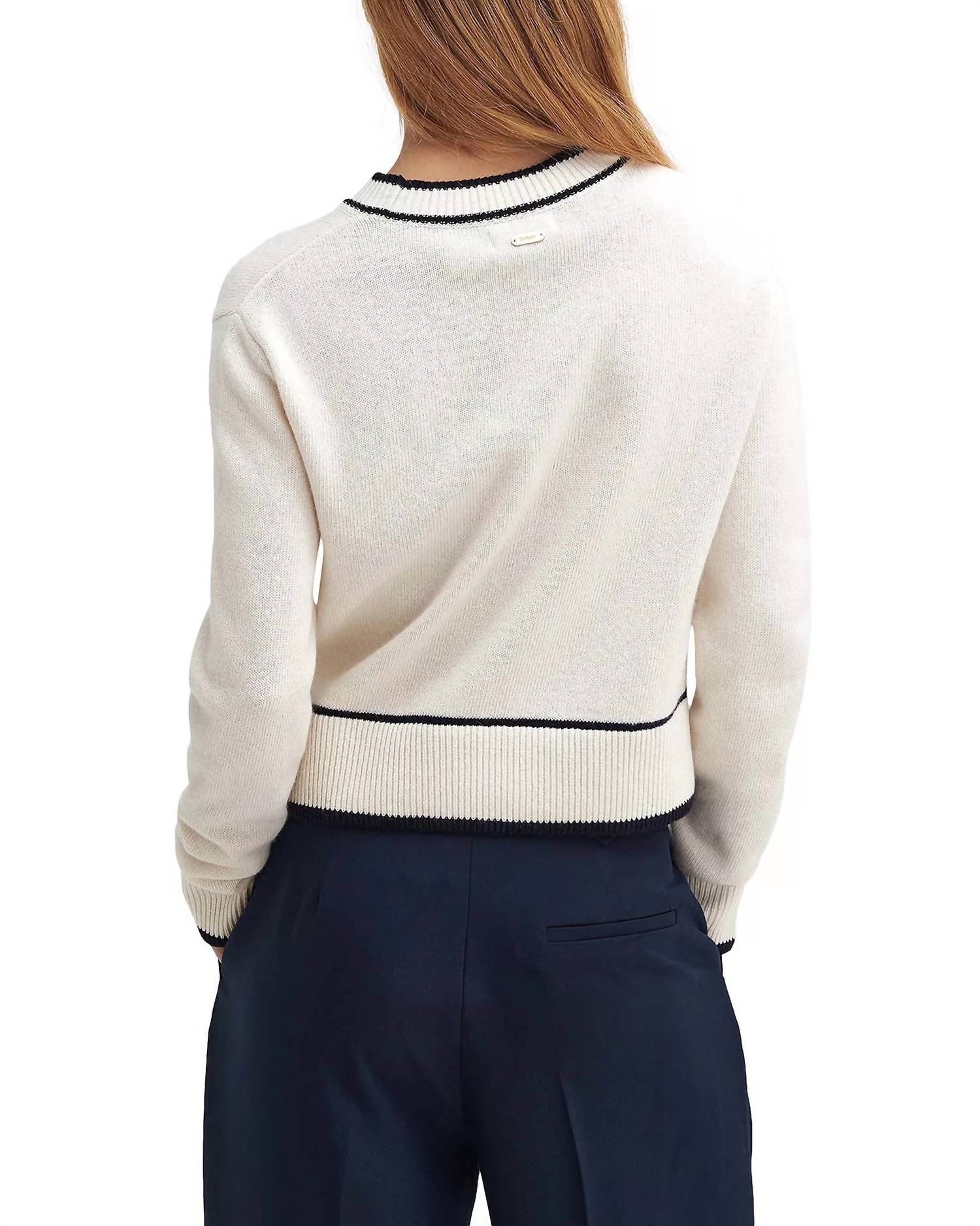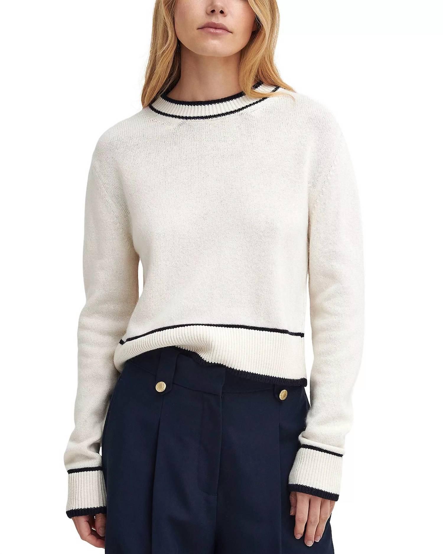The perfect long sleeve tee that goes with just about anything. Discover the Rochelle Knit Top by Barbour, a minimalist essential for winter travel in classic white. This women's solid long sleeve tee is crafted from a soft wool and cotton blend, featuring a crewneck and contrast tipping at the edges. Made in Turkey, this pullover style top ensures a relaxed fit while maintaining effortless sophistication. Care for it with a gentle hand wash.