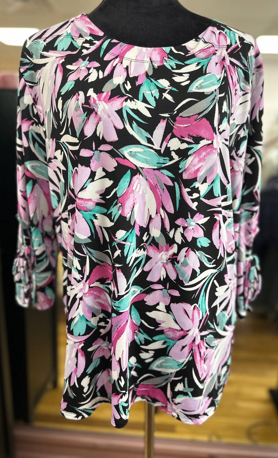 A long sleeve top you can wear with denim, skirts, well... just about anything! Embrace vibrant style with the Women's Three Quarter Sleeve Top by bebe, showcasing a striking Black Lilac floral pattern perfect for spring vacays. Designed with a crewneck and three-quarter sleeves, this pull-on top ensures comfort and ease. Crafted from 96% polyester and 4% spandex, it offers a lightweight feel in a maximalist trend. Care instructions include machine wash and tumble dry for your convenience.