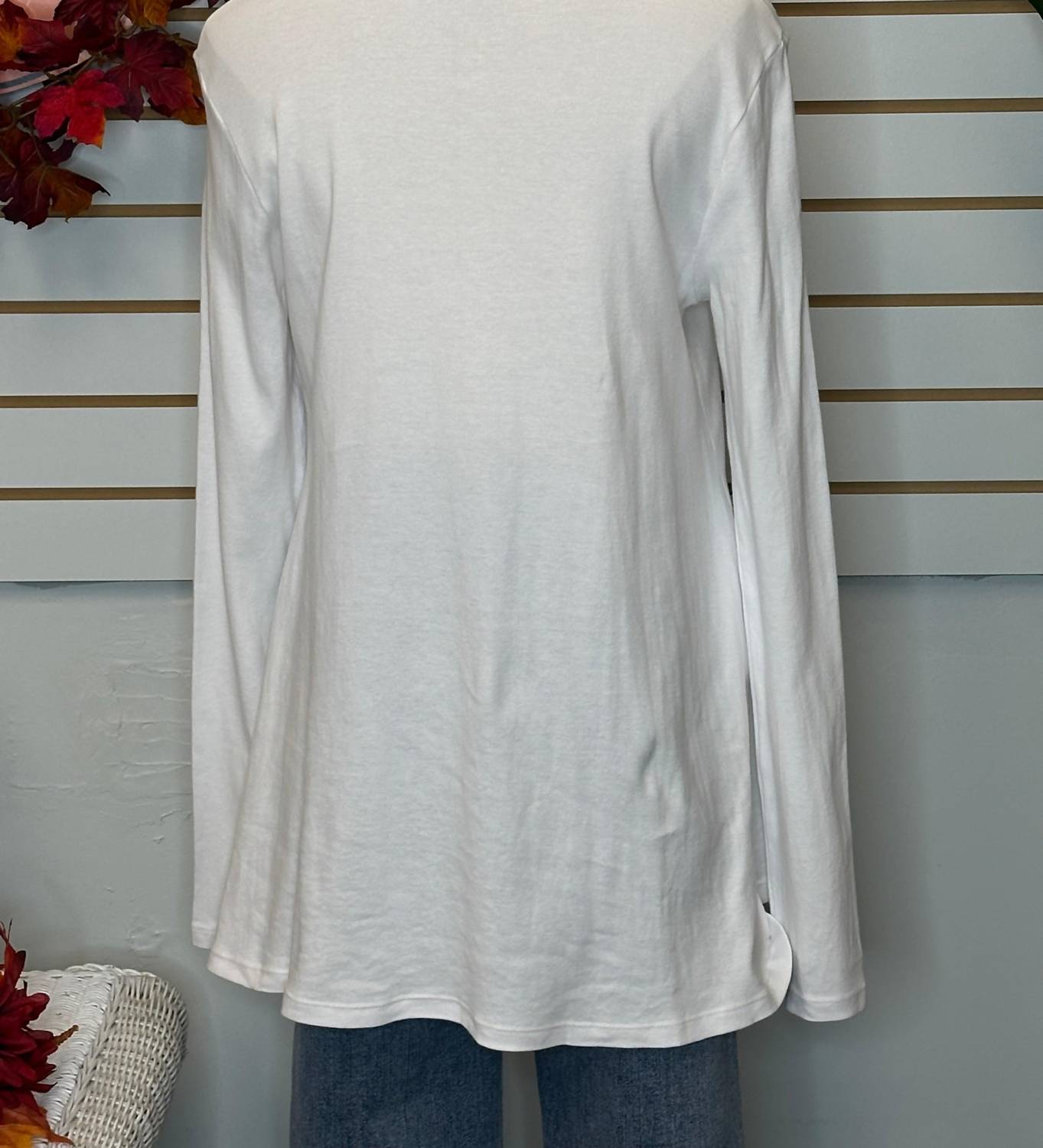 The perfect long sleeve tee that goes with just about anything. Elevate your wardrobe with the Patterson Turtleneck Blouse by Cotton Lani, a minimalist piece that exudes effortless style. With long sleeves and a cozy turtleneck, this blouse is crafted from 100% pre-washed cotton, ensuring both breathability and durability. Designed as a solid white staple, its pull-on closure makes it perfect for layering or standalone wear during fall vacations or Thanksgiving gatherings. Care for this high-quality garment is simple: machine wash and line dry to maintain its refined drape and softness.