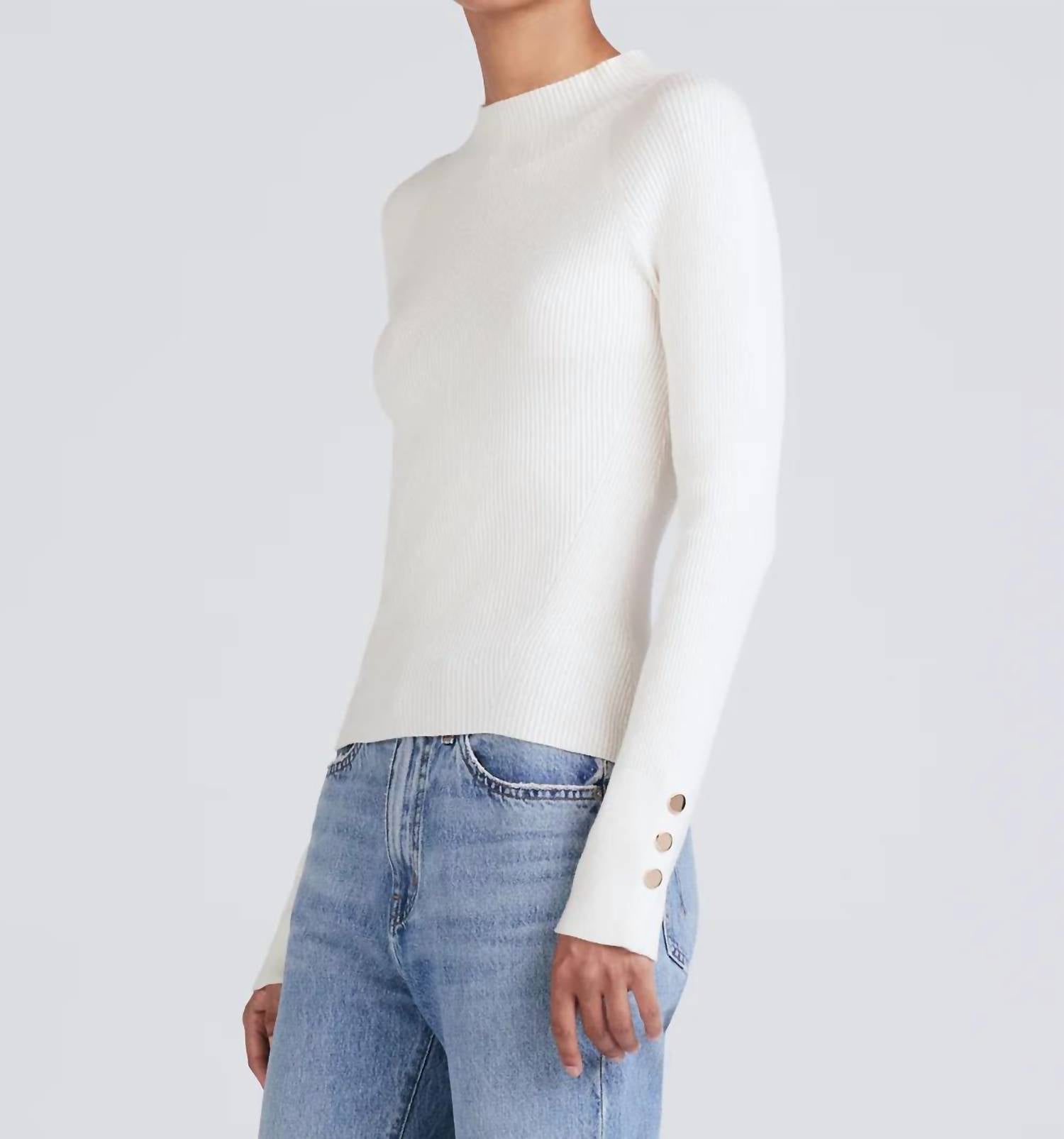 Great fit, cute design, soft fabric. You'll love everything about this long sleeve tee. The Women's Kassandra Ribbed Mock Neck Sweater by Derek Lam 10 Crosby is the perfect blend of warm style and minimalist elegance in a chic ivory hue. Featuring long sleeves and a structured mock neck, this sweater is crafted from a blend of 41% Cotton, 40% Nylon, 16% Wool, and 3% Spandex. Designed with a pull-on closure, this solid-patterned piece is ideal for layering, especially for a dinner party setting. For care, this sophisticated sweater requires dry cleaning. Model is 5'9" and wearing a size small.