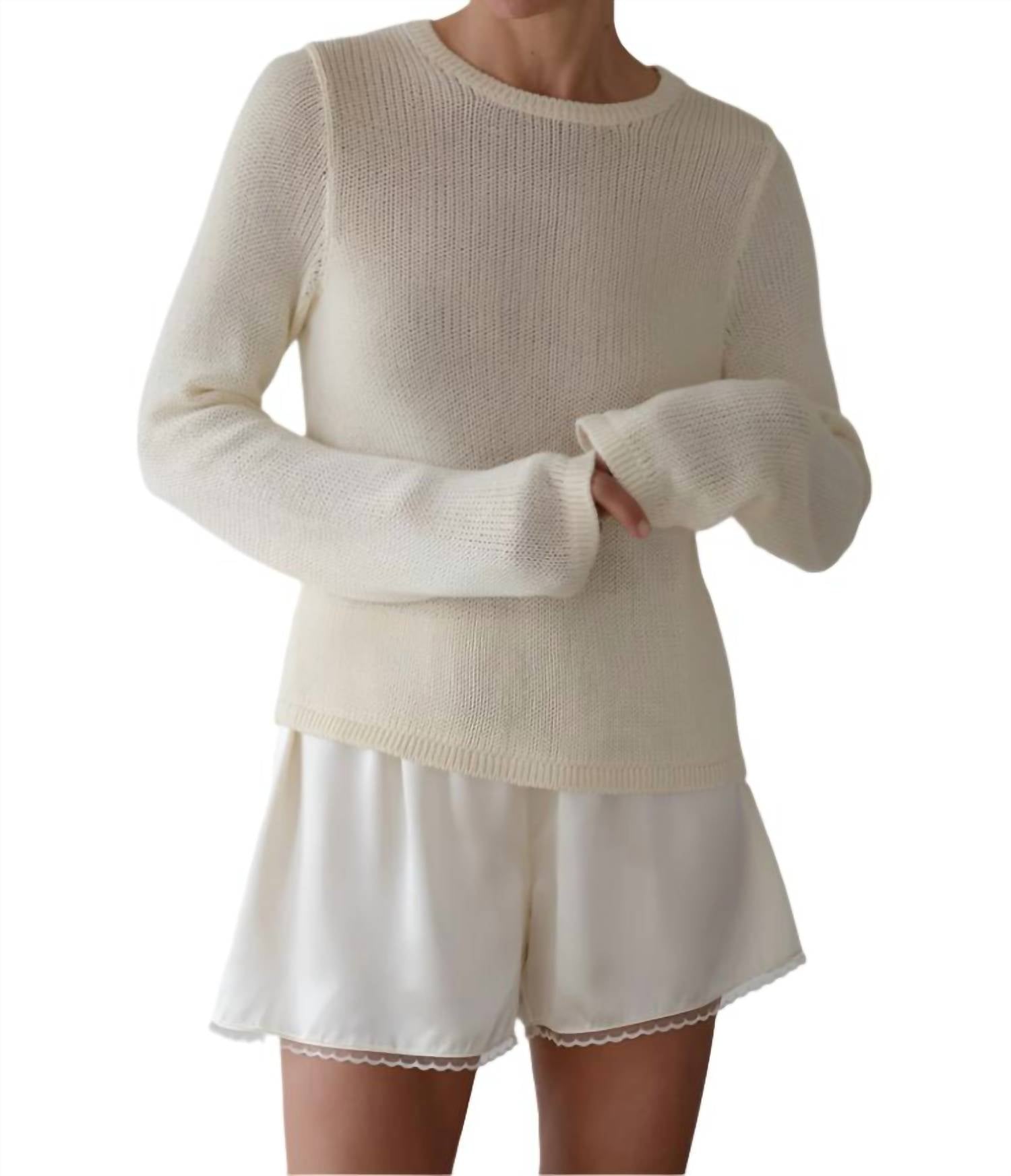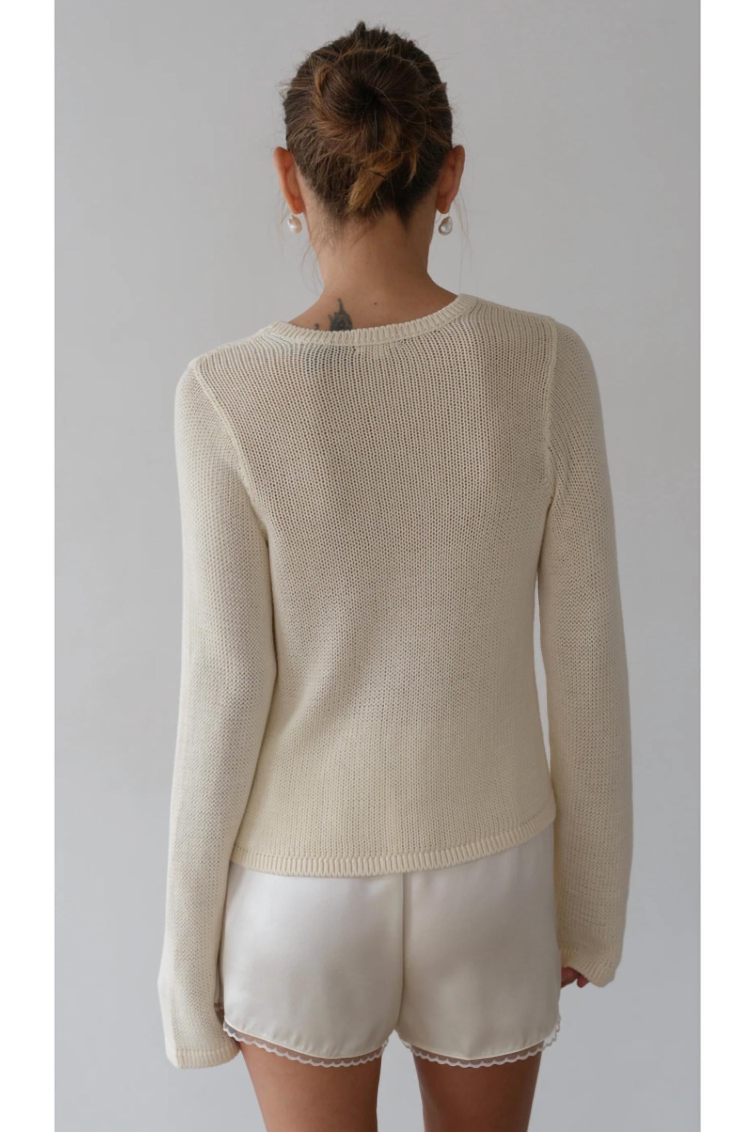 Great fit, cute design, soft fabric. You'll love everything about this long sleeve tee. The Knit Crewneck Long Sleeve Top by DONNI. in a chic creme hue is an ideal addition to any travel wardrobe. With its long sleeves, it is made from 100% cotton, offering a lightweight and breathable feel complemented by a textured, open-knit. This relaxed silhouette is crafted in the U.S. and features a classic crew neckline, finished with ribbed trim. Closure type: Pull on. Care instructions: Dry clean only. Model Simone is 5’8” with a 33 1/2” bust, 24 1/2” waist, and 34 1/2” hips, wearing a size small.