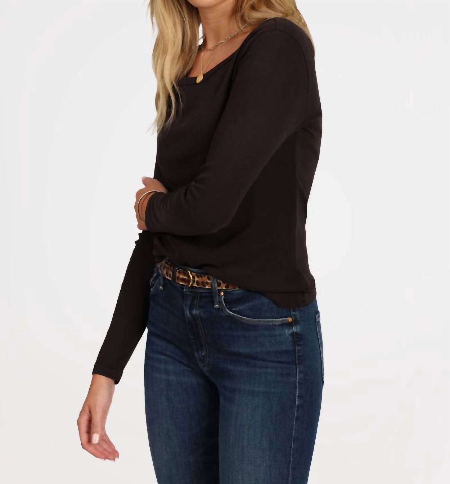 Great fit, cute design, soft fabric. You'll love everything about this long sleeve tee. Introducing the Long Sleeve Modern Crew Tee by Dylan, a timeless piece in Ranch Black perfect for fall travel and Thanksgiving gatherings. This solid, 100% cotton tee features a classic crewneck and a convenient pull-on closure. Care for it easily with a machine wash on a cold gentle cycle, but avoid ironing, tumble drying, or dry cleaning to maintain its style. Designed for women, this tee is a nod to 90s fashion, fitting true to size for a comfortable and modern look.