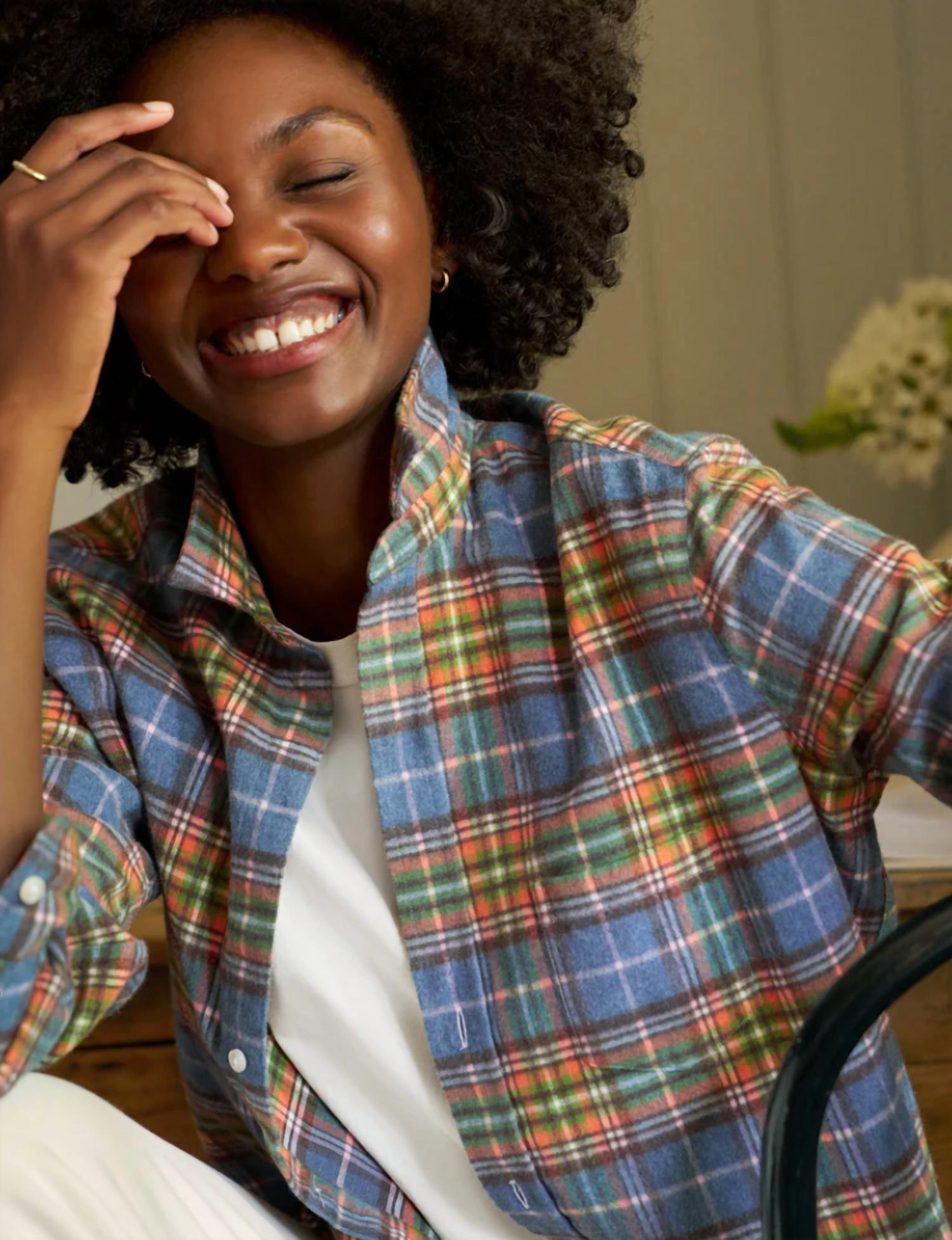 A long sleeve top you can wear with denim, skirts, well... just about anything! The Eileen Long Sleeve Flannel Top by Frank & Eileen offers a chic maximalist look perfect for holiday parties. This women’s shirt, in eye-catching orange and green plaid, features three-quarter sleeves and a classic collar. Constructed from 100% cotton Italian flannel, it ensures both style and comfort. Closure: Button closure. Origin: Woven in Italy, finished in Mexico.