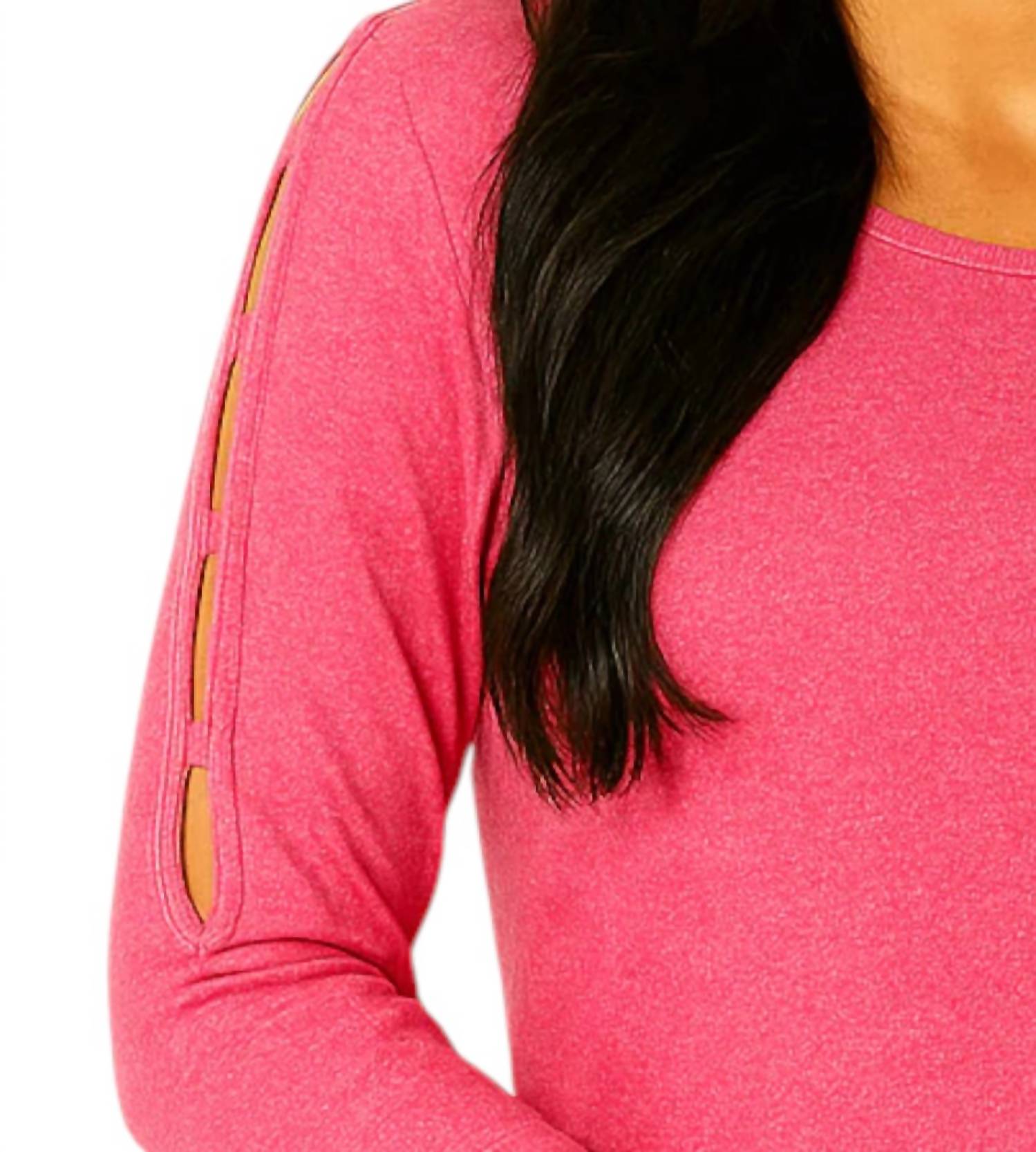 Great fit, cute design, soft fabric. You'll love everything about this long sleeve tee. Elevate your wardrobe with the French Kyss Soft Stretch Sleeve Lattice Crew Neck Top in a sweet Candy hue. This minimalist design features stylish three-quarter sleeves and a flattering hip-length cut. Crafted from a stretchy blend of 79% Viscose, 18% Polyester, and 3% Elastane, this imported top promises both comfort and elegance. With an easy pull-on closure, it's perfect for effortless vacation styling. Care consists of a delicate hand wash or dry clean.