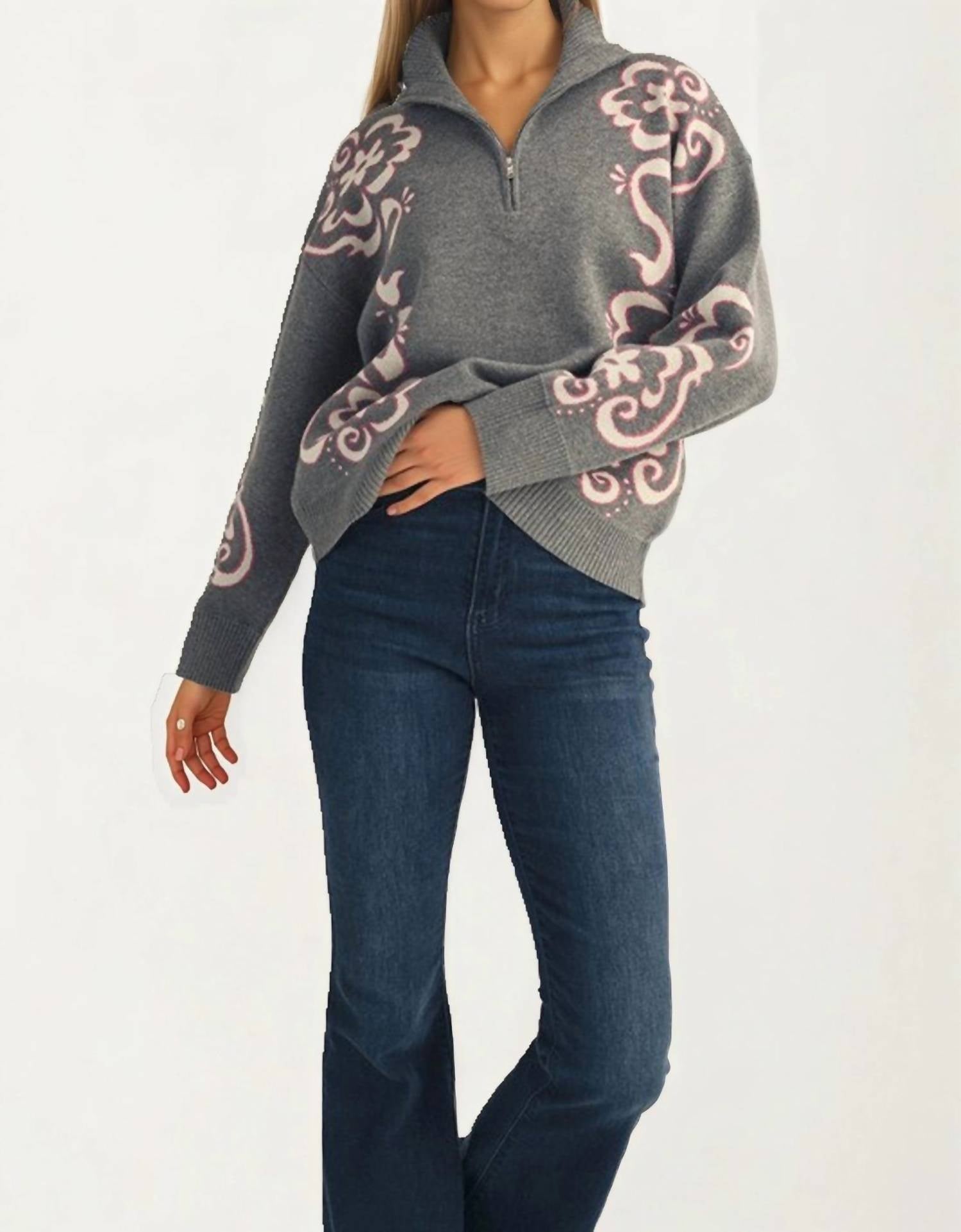 A long sleeve top you can wear with denim, skirts, well... just about anything! Introducing the All My Love Top by Jodifl in a versatile gray, perfect for any fall wardrobe. This top features a mockneck design with stylish 2/3 length long sleeves and a convenient quarter zip closure. The soft viscose blend combines 50% viscose, 28% polyester, and 22% nylon for refined comfort with a patterned minimalist trend. Care is simple with machine wash and tumble dry instructions, making it ideal for travel and casual Thanksgiving gatherings.
