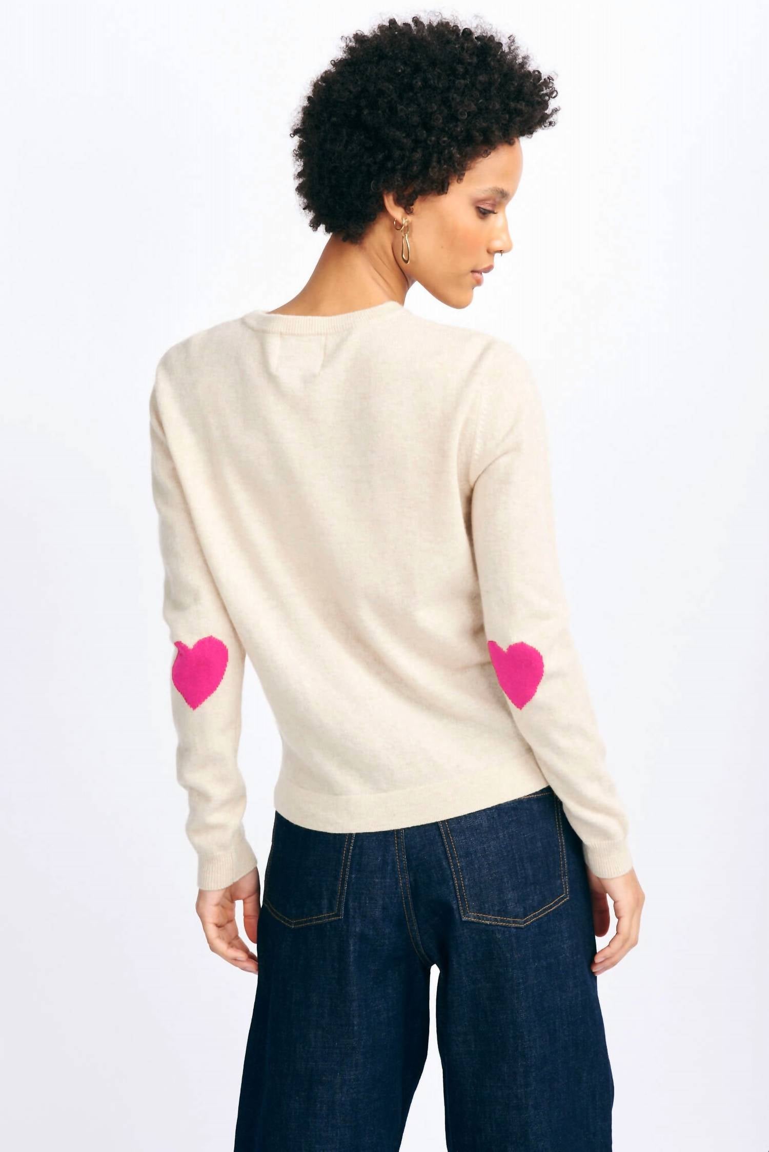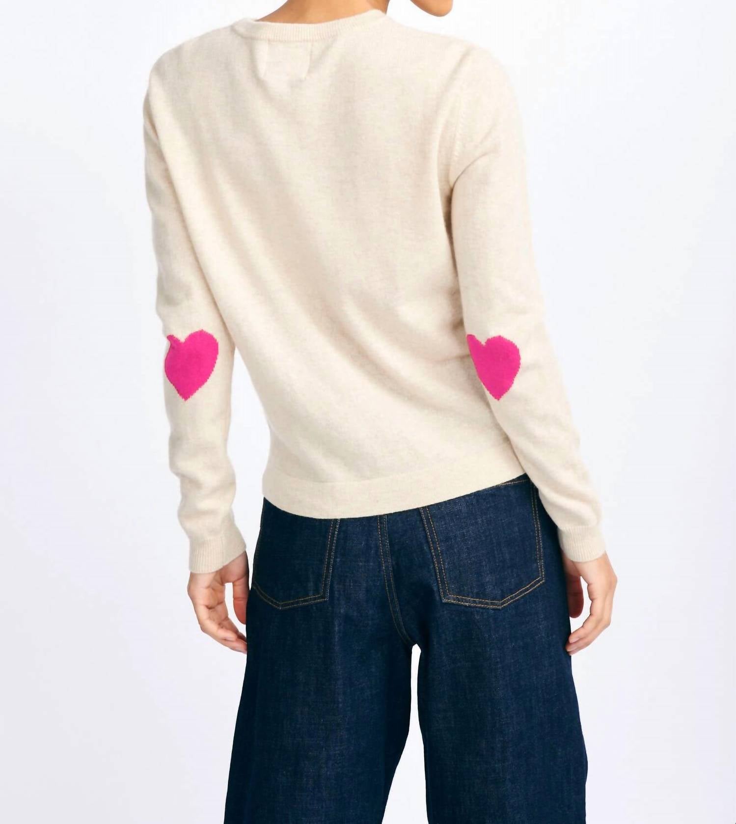 The perfect long sleeve tee that goes with just about anything. This crew neck top is crafted from 100% cashmere and features hot pink intarsia hearts on each elbow. Designed with a classic, true-to-size fit, it combines timeless style with a playful touch.