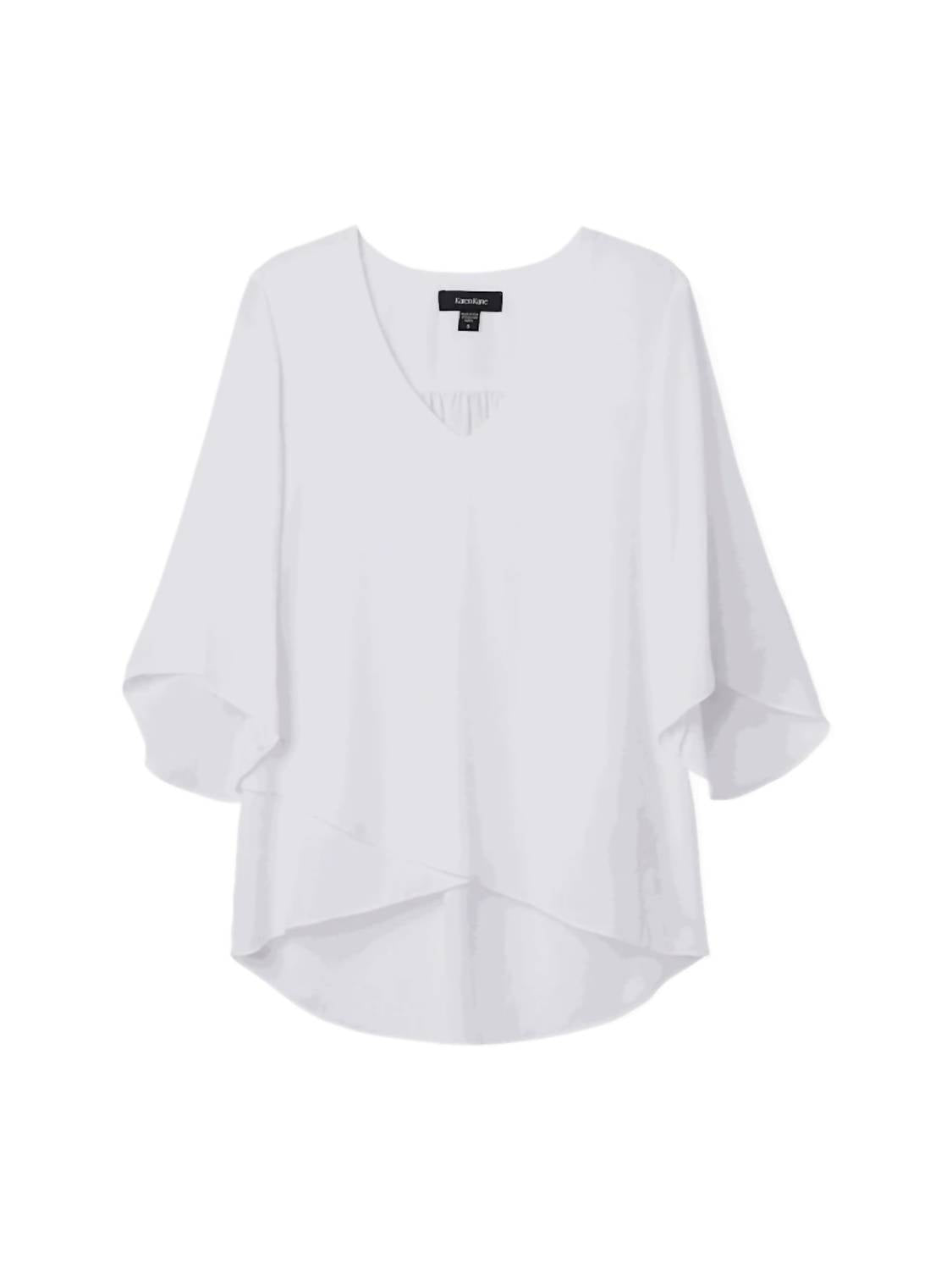 The perfect long sleeve tee that goes with just about anything. Elevate your wardrobe with the Bracelet Sleeve Asymmetric Top by Karen Kane, crafted from luxurious silky crepe for a refined look. This off-white top features three-quarter flare sleeves and a layered asymmetrical hem, providing a chic touch to any outfit. Composition: 100% Polyester. Garment Length: 26.38 inches. Made in the USA of imported fabric. Hand wash cold, hang to dry or dry clean.