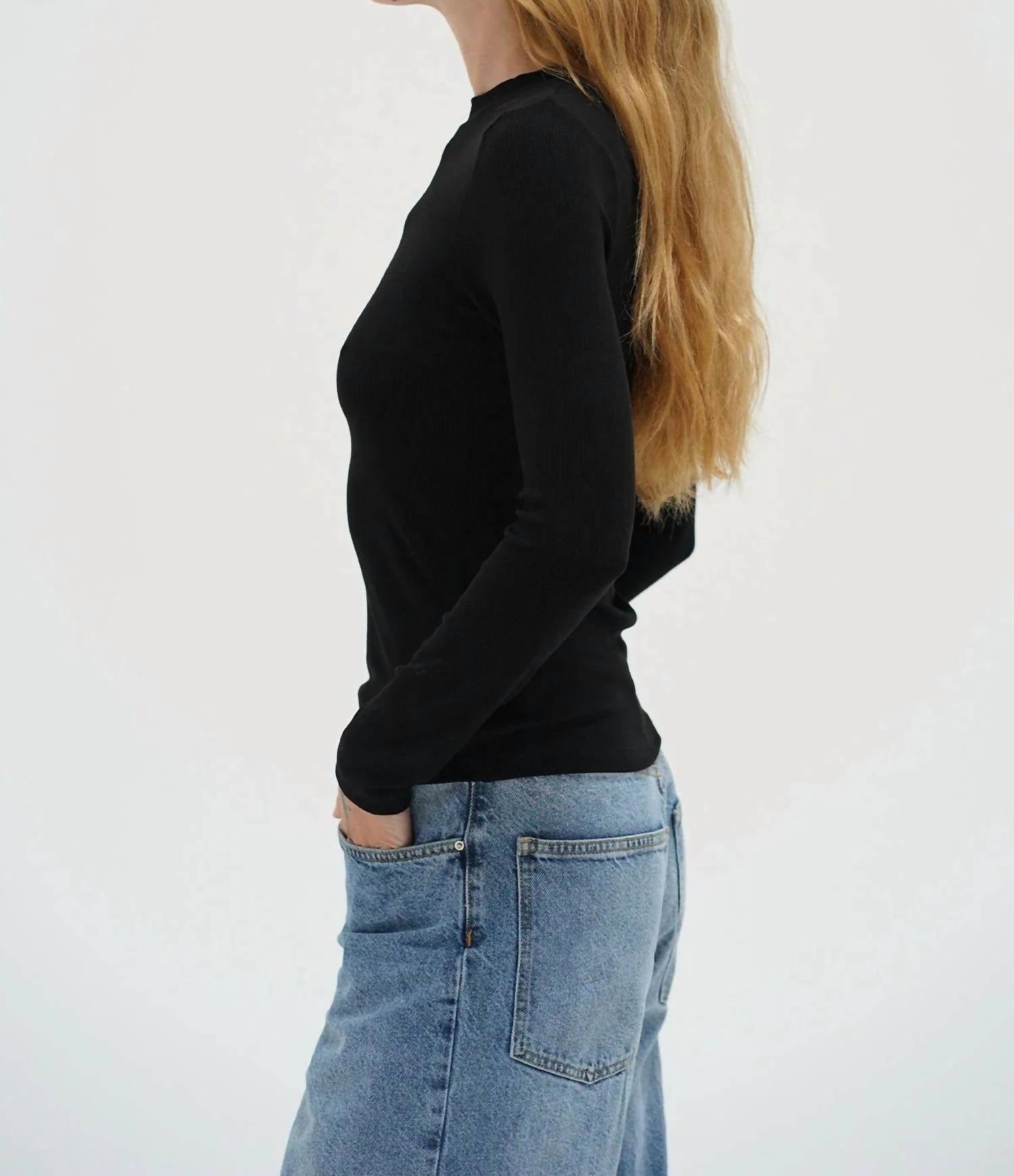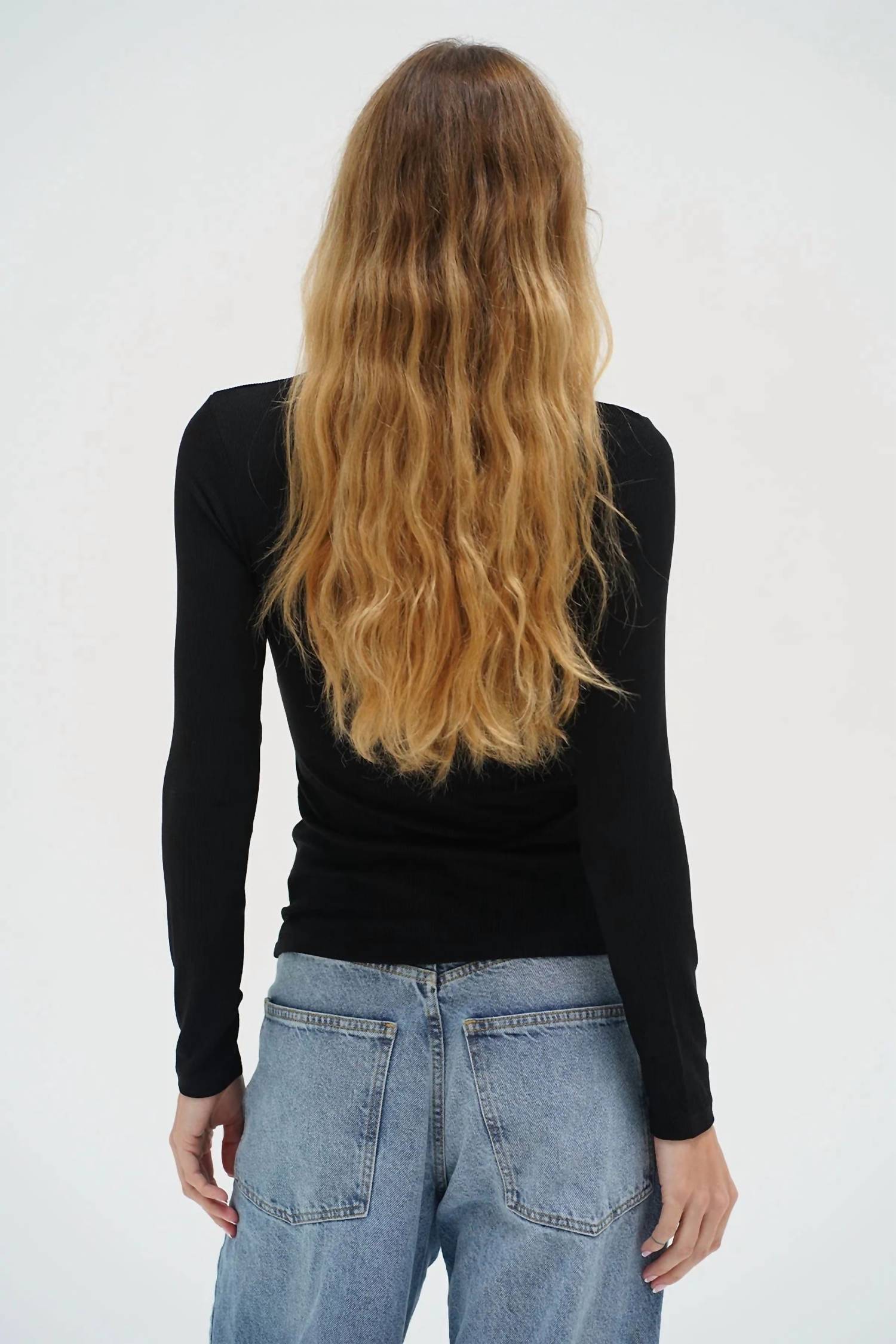 The perfect long sleeve tee that goes with just about anything. Introducing the Dalston Ribbed Long Sleeve Top by LNA, a minimalist essential in classic black. This fitted pullover is crafted from a blend of 95% Rayon and 5% Spandex, offering a buttery soft, body-hugging, full-length fit. Made in the USA, it features a crew neckline and a second-skin feel for luxurious comfort. Enjoy hassle-free care with a pull-on closure and washing instructions suited for a machine wash cold and tumble dry low. Model is 5'9.5" and wearing a size small.