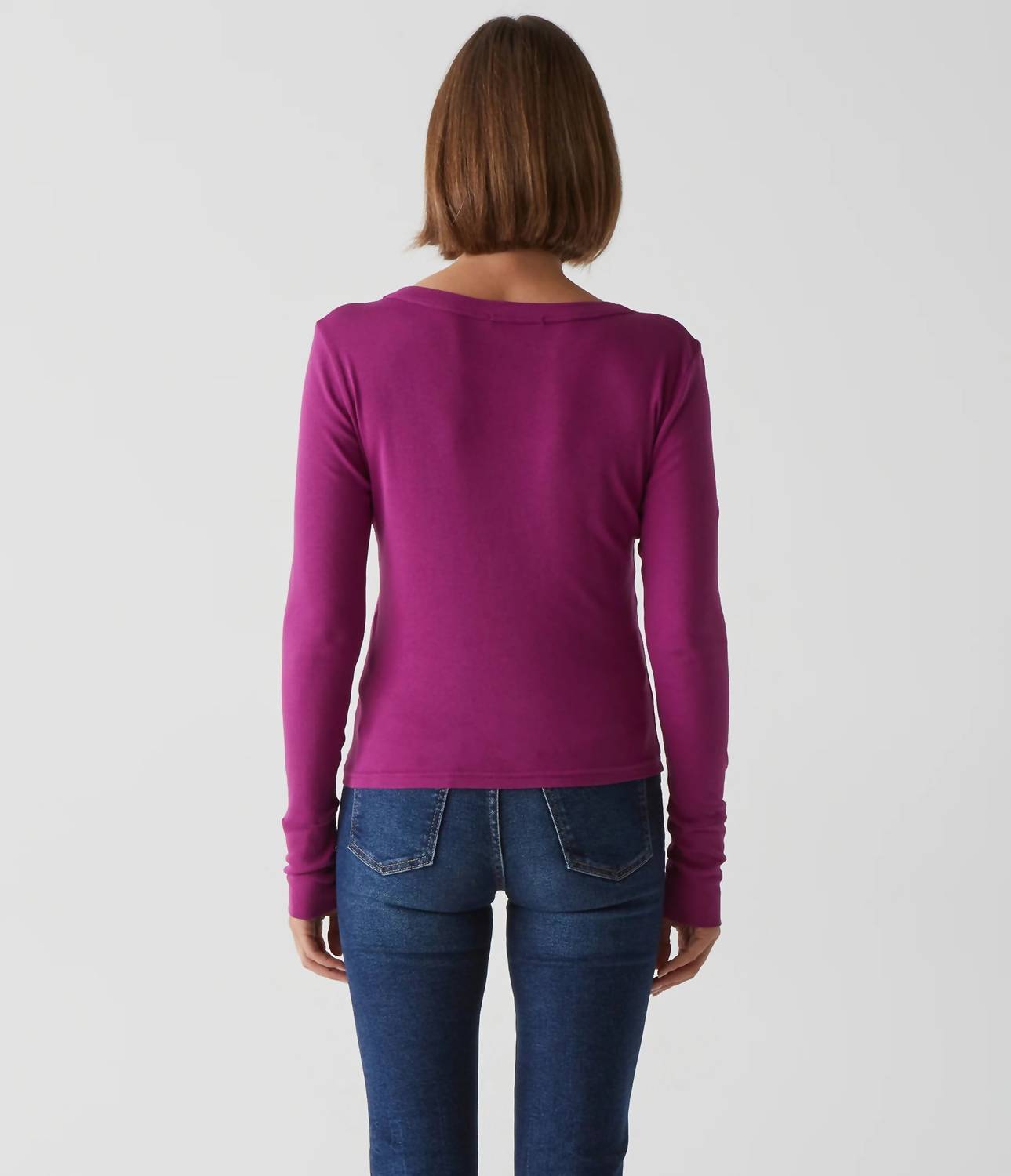The perfect long sleeve tee that goes with just about anything. Discover the Logan V-neck Tee by Michael Stars, a must-have in a rich berry hue for your capsule wardrobe. This women's long sleeve tee is made from 100% Supima cotton, offering a supersoft feel with a flattering V-neckline and fitted silhouette. With a garment length of 23 inches (size Small), it provides a minimalist and versatile option for fall occasions like Thanksgiving dinner parties. Featuring a pull-on style, it's easy to care for with machine wash and tumble dry instructions, and it's crafted with quality in mind, being imported. Ideal for sizes 2-10.
