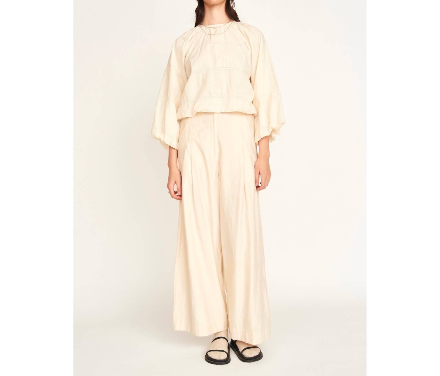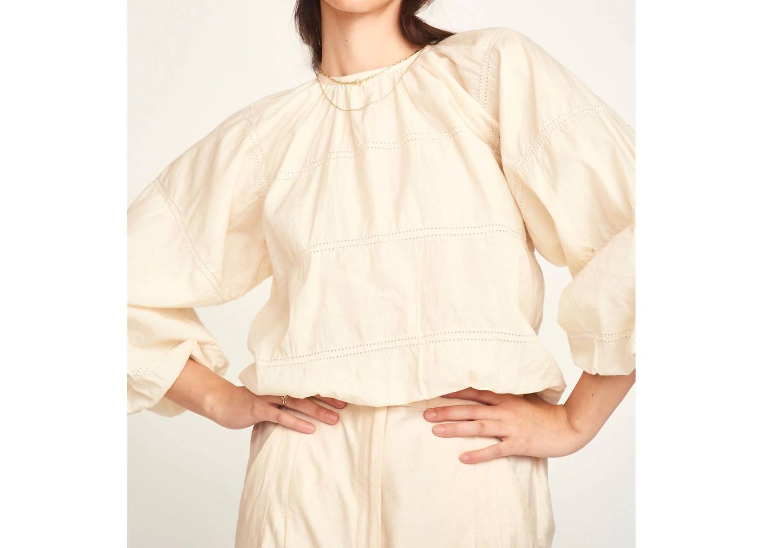 A long sleeve top you can wear with denim, skirts, well... just about anything! Minimalist piece perfect for any spring occasion. Long-sleeve top features puff sleeves with a hidden elastic cuff and a bubble cropped silhouette, enhanced with a soft elastic hem for a flattering fit. Crafted from 100% soft and light cotton, both lining and outer material, measures 18 inches in length from the high point of the shoulder in size small. Made in India. Requires careful care with hand wash in cold water using pH-neutral soap and hang drying.