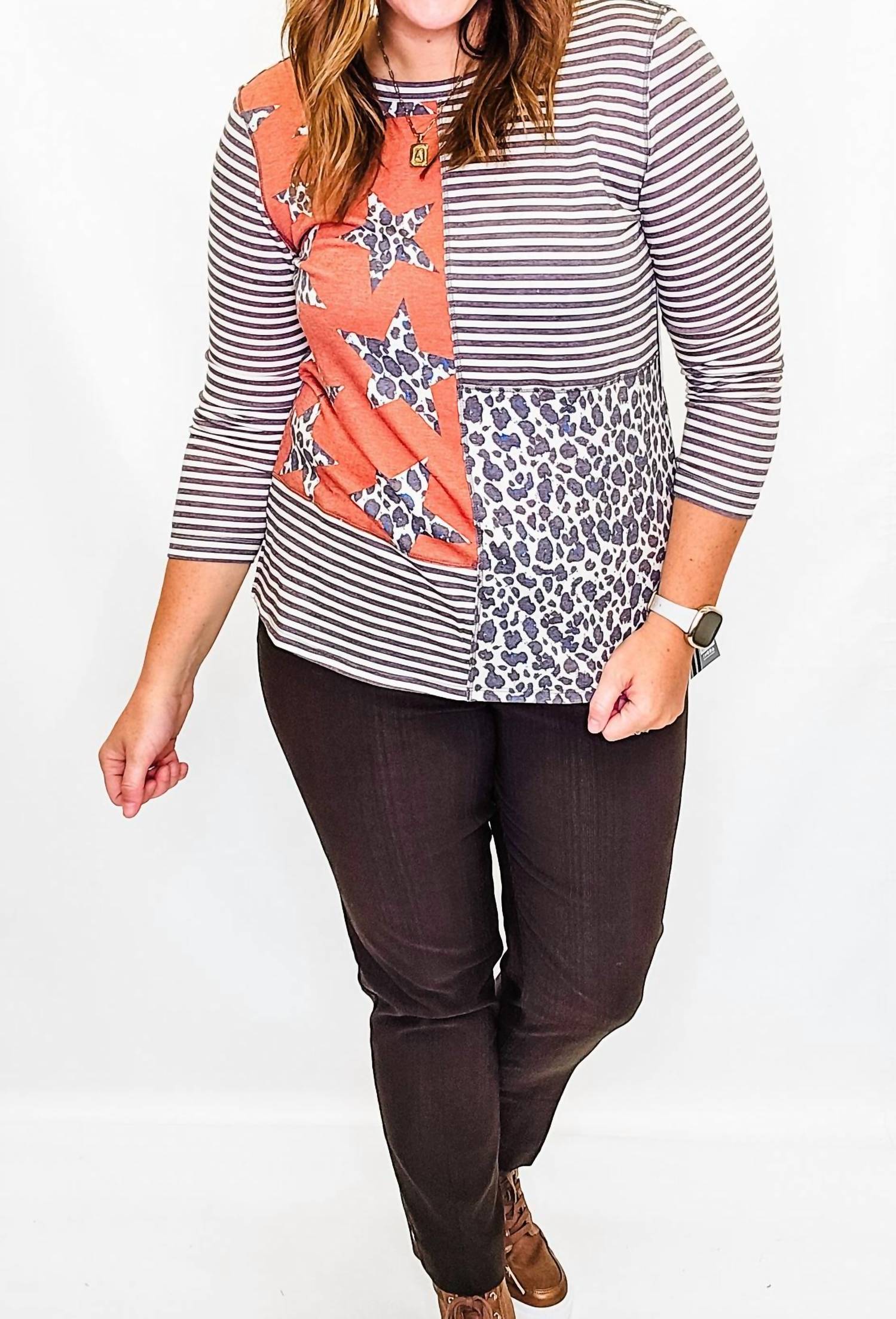 The perfect long sleeve tee that goes with just about anything. Introducing the Multiples Three-Quarter Sleeve Top from the Cinnamon Collection, a truly striking choice for a unique look. This top boasts an 70% polyester and 30% rayon blend, offering comfort and style with a rich color block design featuring stars, stripes, and leopard prints in browns, creams, with a touch of blue. Its pull-on closure and round neck make it easy to wear, while its maximalist design is perfect for Thanksgiving or travel occasions. Care for this garment is easy with machine wash cold and line dry instructions, ensuring it stays looking vibrant and fresh.
