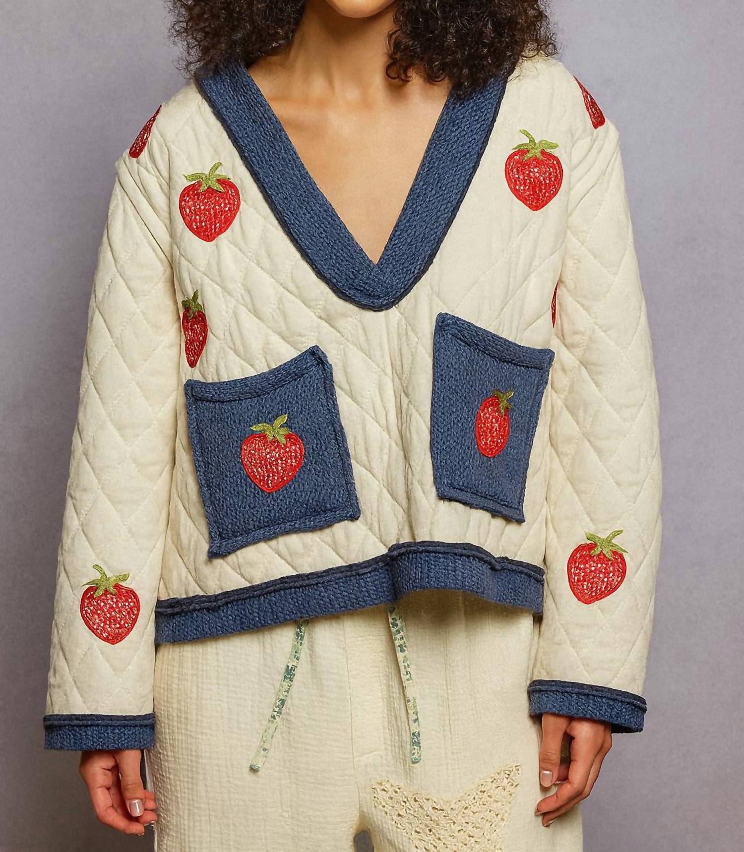 Pol - Embroidered Strawberry Quilted Pullover Top