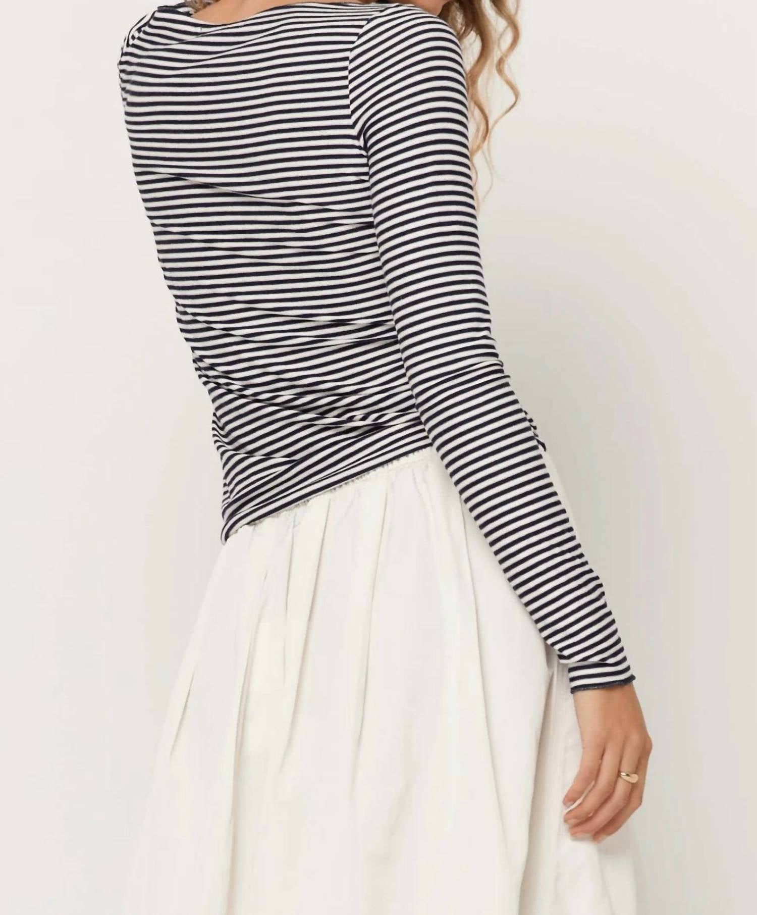 A long sleeve top you can wear with denim, skirts, well... just about anything! Elevate your wardrobe with the Zinnia Boatneck Top by Project Social T, a chic option in Navy Stripe perfect for any occasion. This long sleeve top is crafted from luxurious Rayon, offering a soft feel and a flattering boat neckline. Designed with a classic stripe pattern and pull-on closure, it's effortlessly stylish. Care for this piece by machine washing and laying it flat to dry, ensuring it maintains its refined look.