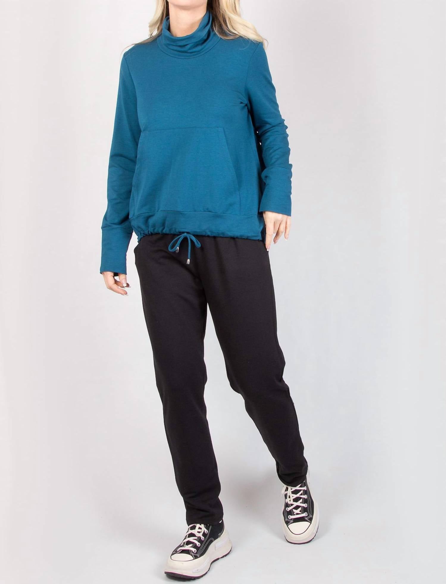 Great fit, cute design, soft fabric. You'll love everything about this long sleeve tee. The Pure Essence Relaxed Bamboo Drawstring Hem pullover is a wardrobe must. This top is so easy to wear in a breathable bamboo jersey, it has a draped turtleneck, a front pocket, a drawstring hem that hits the perfect spot on your hips. In a saturated teal jewel tone, think a rich elevate look without even trying. Throw it on with jeans or a skirt for effortless everyday chic. Made in Canada. True sizing.