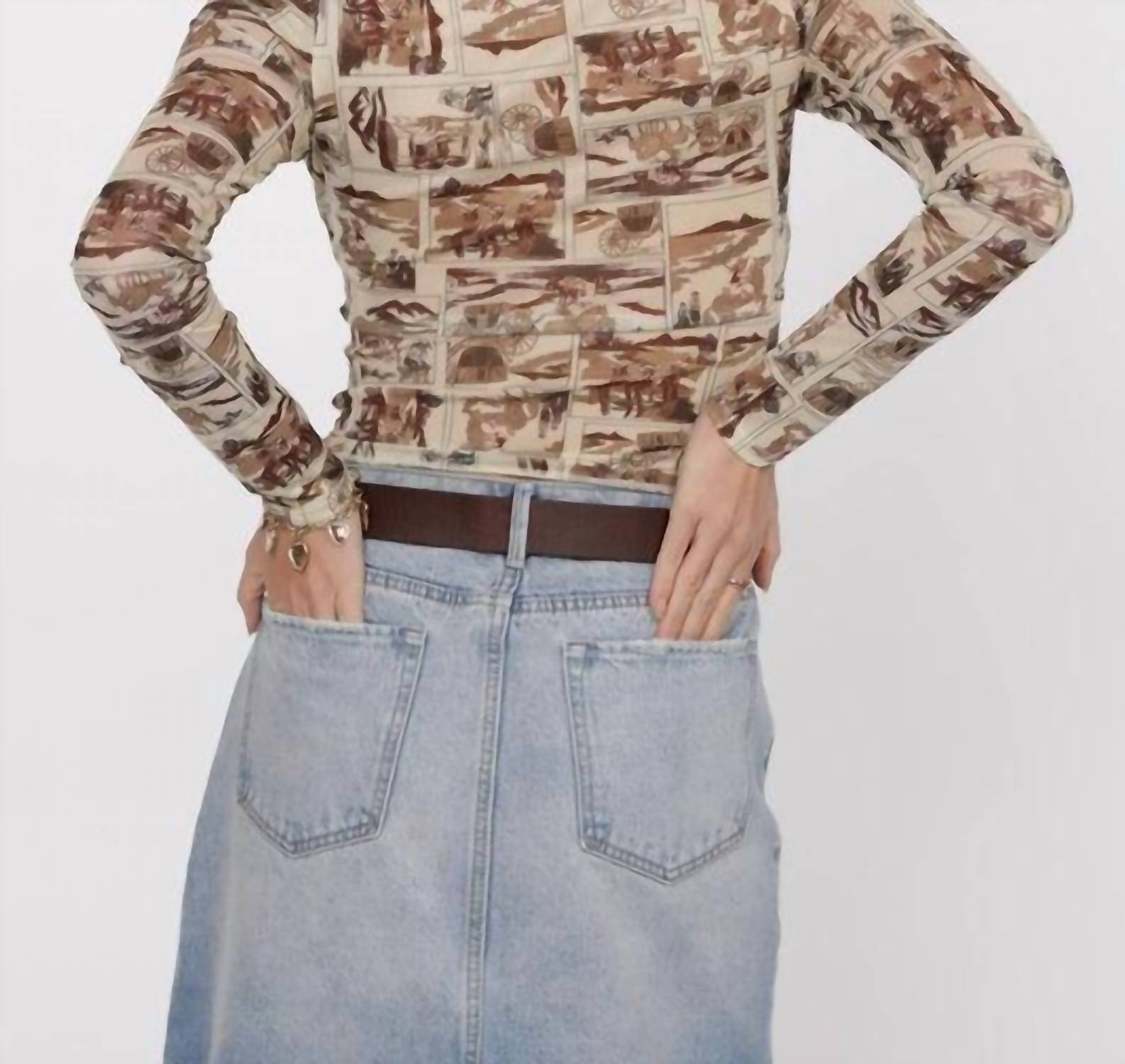Great fit, cute design, soft fabric. You'll love everything about this long sleeve tee. Embrace your adventurous spirit with the Giddy up Mock Neck Long Sleeve Mesh Top by SAGE THE LABEL. This top, in a striking brown multi pattern, features long sleeves and a chic mockneck design, crafted from 93% polyester and 7% spandex for a comfortable fit. Its pull-on closure ensures ease and style, making it ideal for any occasion, from a night out to a day trip. To maintain its vibrant look, hand wash and lay flat to dry.