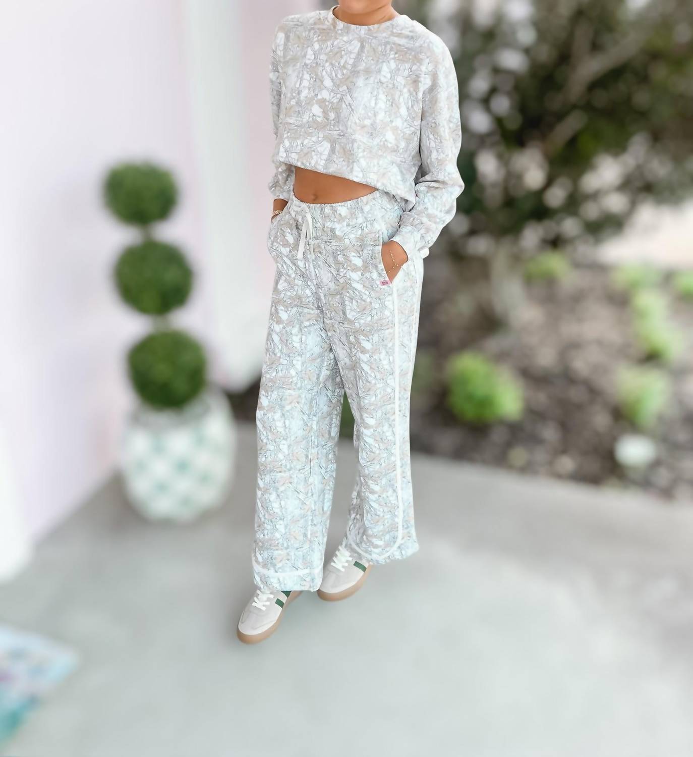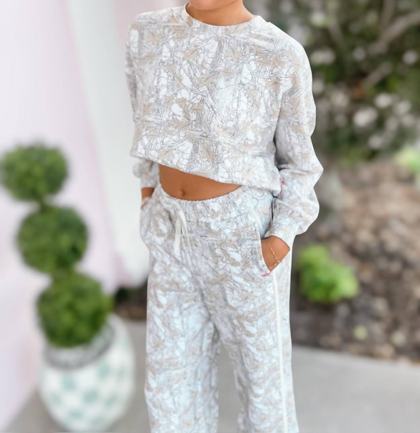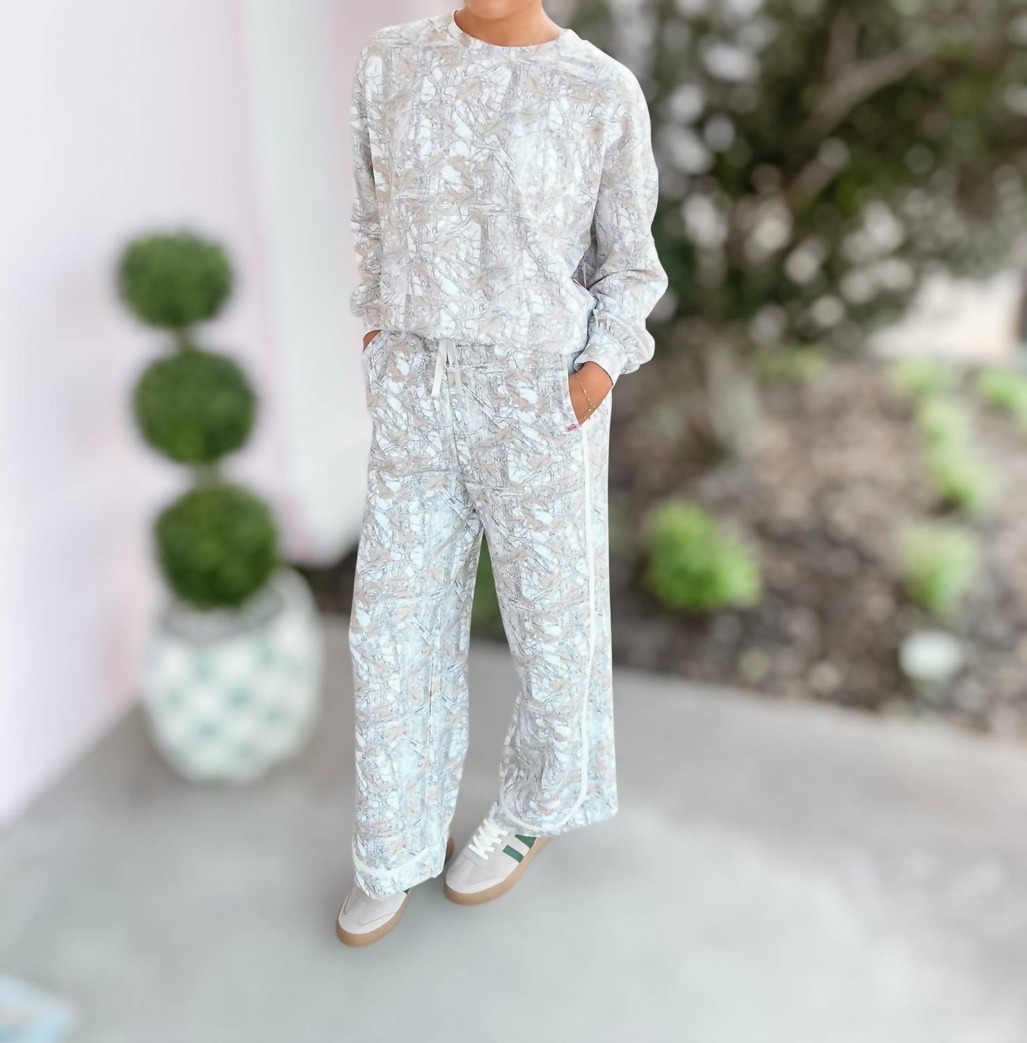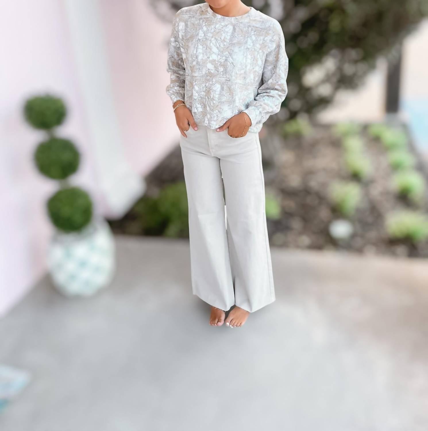 A long sleeve top you can wear with denim, skirts, well... just about anything! Discover the Laney Camo Pullover by Simply Southern, a chic addition to your fall wardrobe in elegant white and beige. This long sleeve top showcases a ribbed crew neckline and rib cuffs, providing comfort and style with its minimalist pattern. Crafted from a blend of 48% Modal, 48% Polyester, and 4% Spandex, this pull-on pullover is perfect for a relaxed vacation look. Care instructions include hand washing and line drying to maintain its styling.