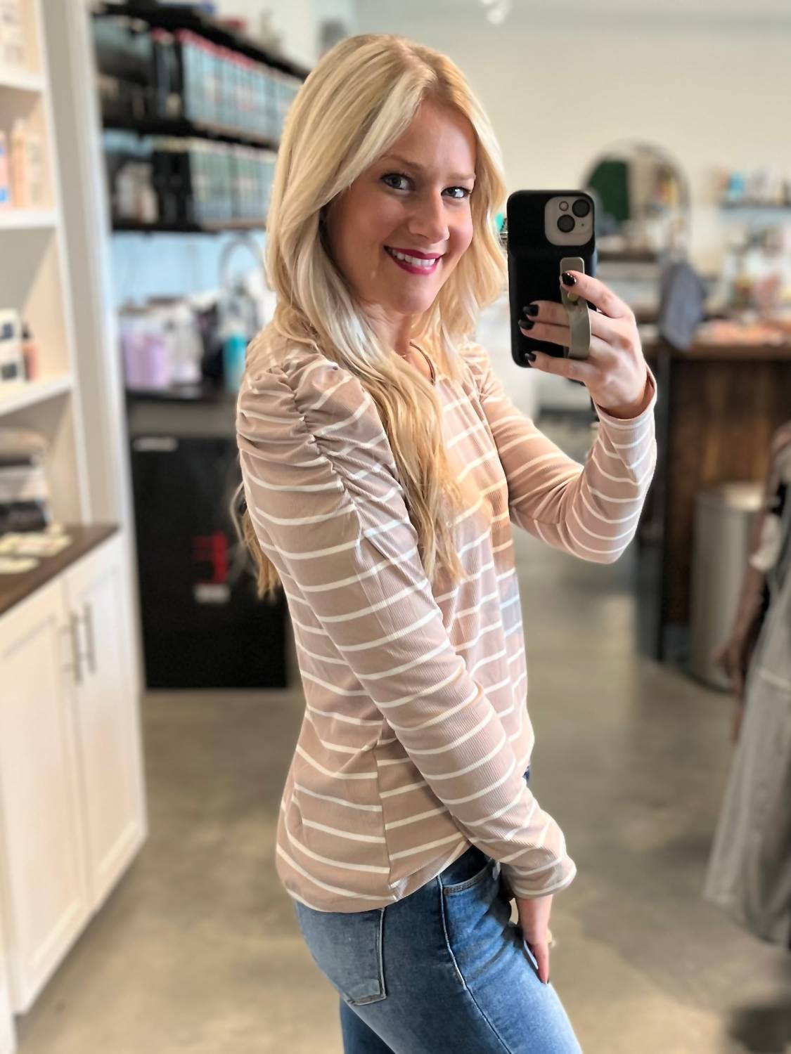 The perfect long sleeve tee that goes with just about anything. Elevate your wardrobe with the Scoop Neck Puffed Long Sleeve Top by STACCATO, featuring a chic scoop neck and a striking taupe and white stripe pattern. The long sleeves are puffed for added flair and the pull-on design offers easy wear. Crafted from a comfortable blend of poly, cotton, and span, this top is perfect for spring workwear occasions. Although no specific wash instructions are provided, care for this piece to maintain its vibrant look.