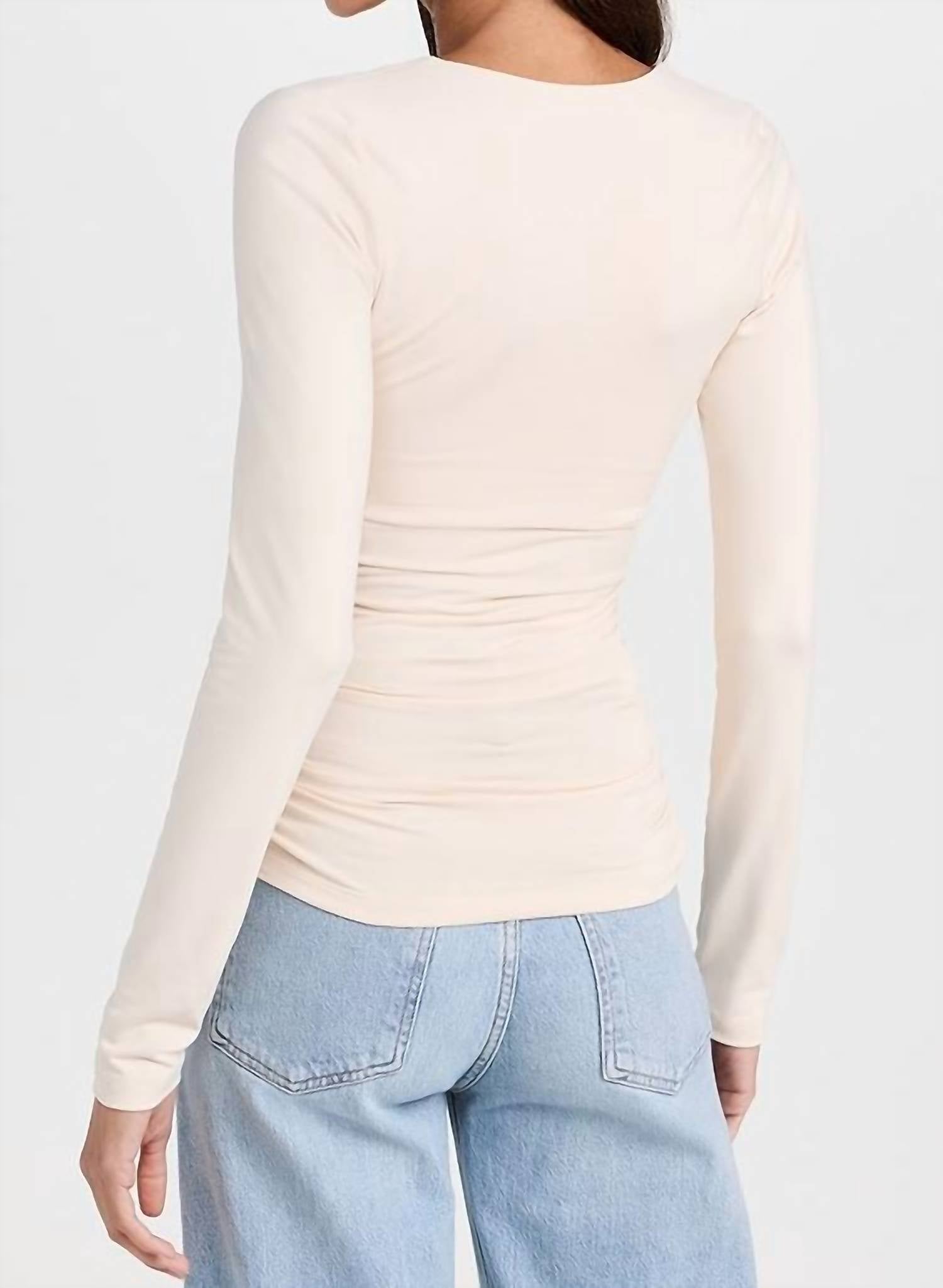 Great fit, cute design, soft fabric. You'll love everything about this long sleeve tee. Introducing the V-neck Gathered Long Sleeve Top by Susana Monaco in elegant Belgian Creme, a perfect addition for a minimalist and sophisticated look. This women's top, made from a nylon blend (94% nylon, 6% spandex), offers a lightweight jersey comfort with a stylish ruched bodice and a boned V-neckline. Designed with long sleeves, it's a versatile piece suitable for holiday parties or simply elevating your everyday wardrobe. This solid-patterned tee is easy to wear with its pull-on closure and is machine washable for fuss-free maintenance.