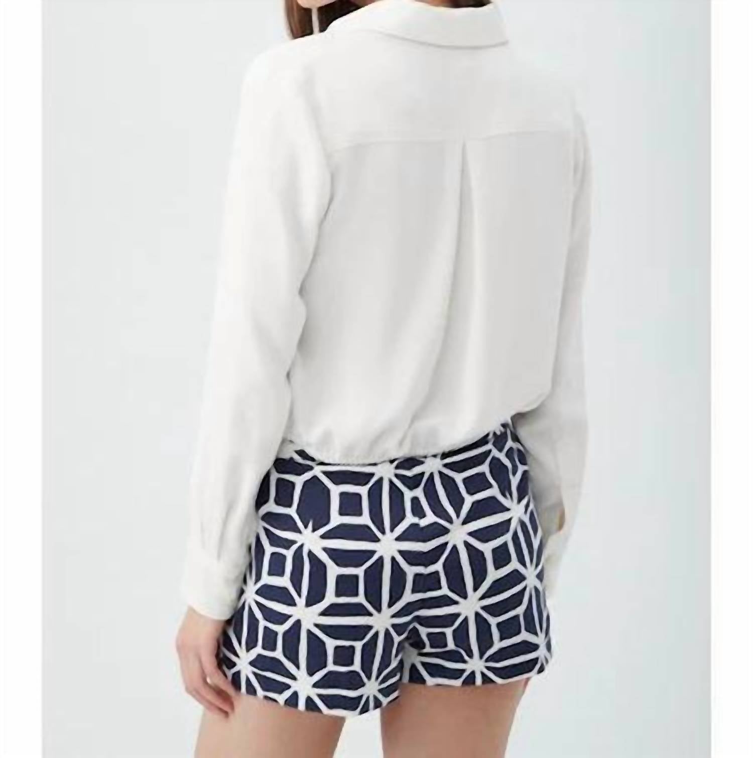 Great fit, cute design, soft fabric. You'll love everything about this long sleeve tee. Embrace chic minimalism with the Trina Turk Renlee Long Sleeve Button-Up Shirt in crisp solid white. This stylish piece features long sleeves with button cuffs, a cinched waist, and a cropped length that creates a flattering, modern silhouette. Finished with a classic collar and button-down placket, it blends timeless tailoring with contemporary design. Easy to care for and endlessly versatile, it’s the perfect choice for polished everyday wear or elevated evening looks.