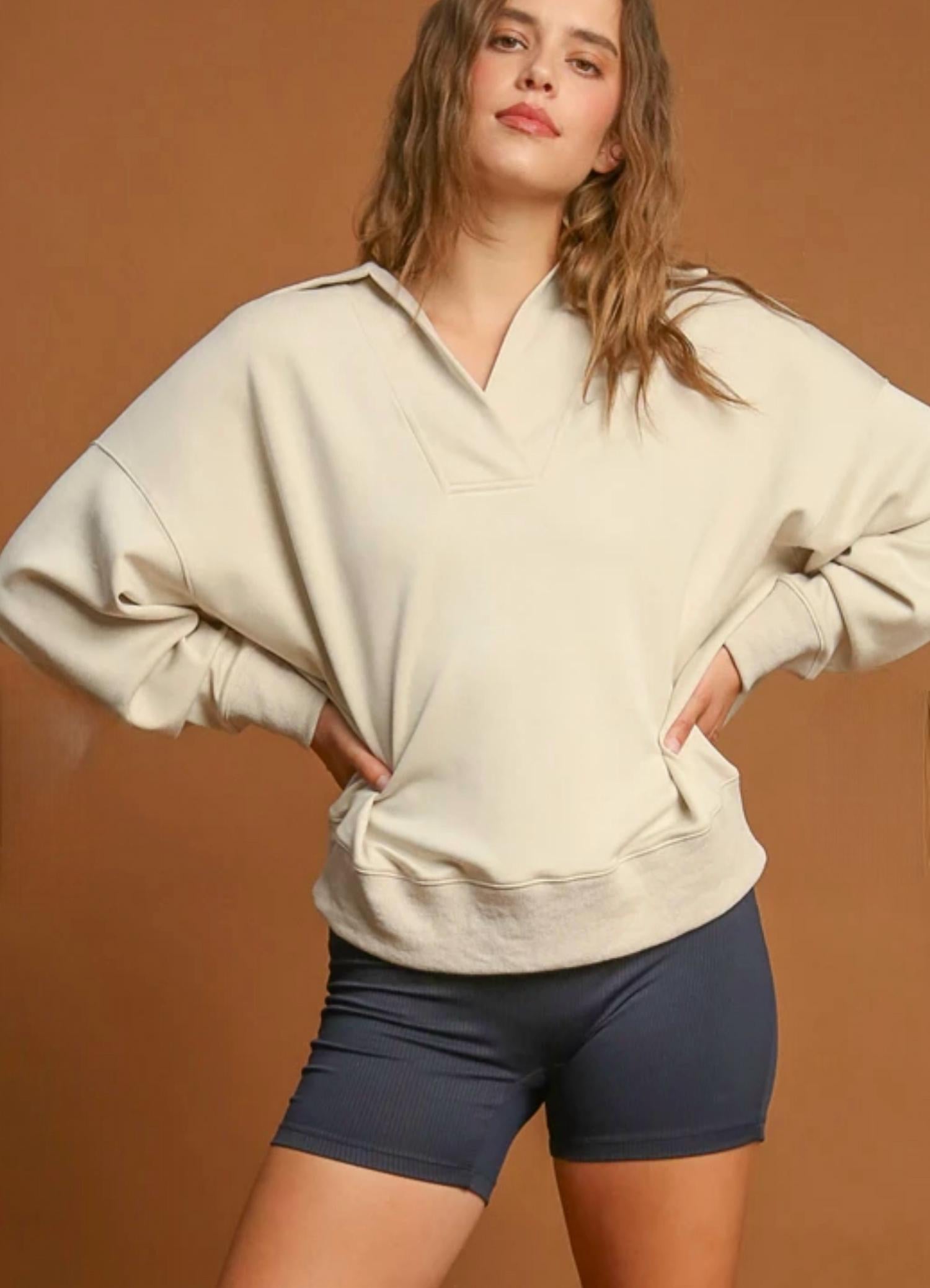 A long sleeve top you can wear with denim, skirts, well... just about anything! • Boxy Cut • Extremely Soft, Buttery Knit Fabric • Polo Long Sleeve • Model is 5'9" and is wearing a small. • All Measurements are approximate. • Not Lined Fabric Contents: • 55% Rayon • 40% Polyester • 5% Spandex