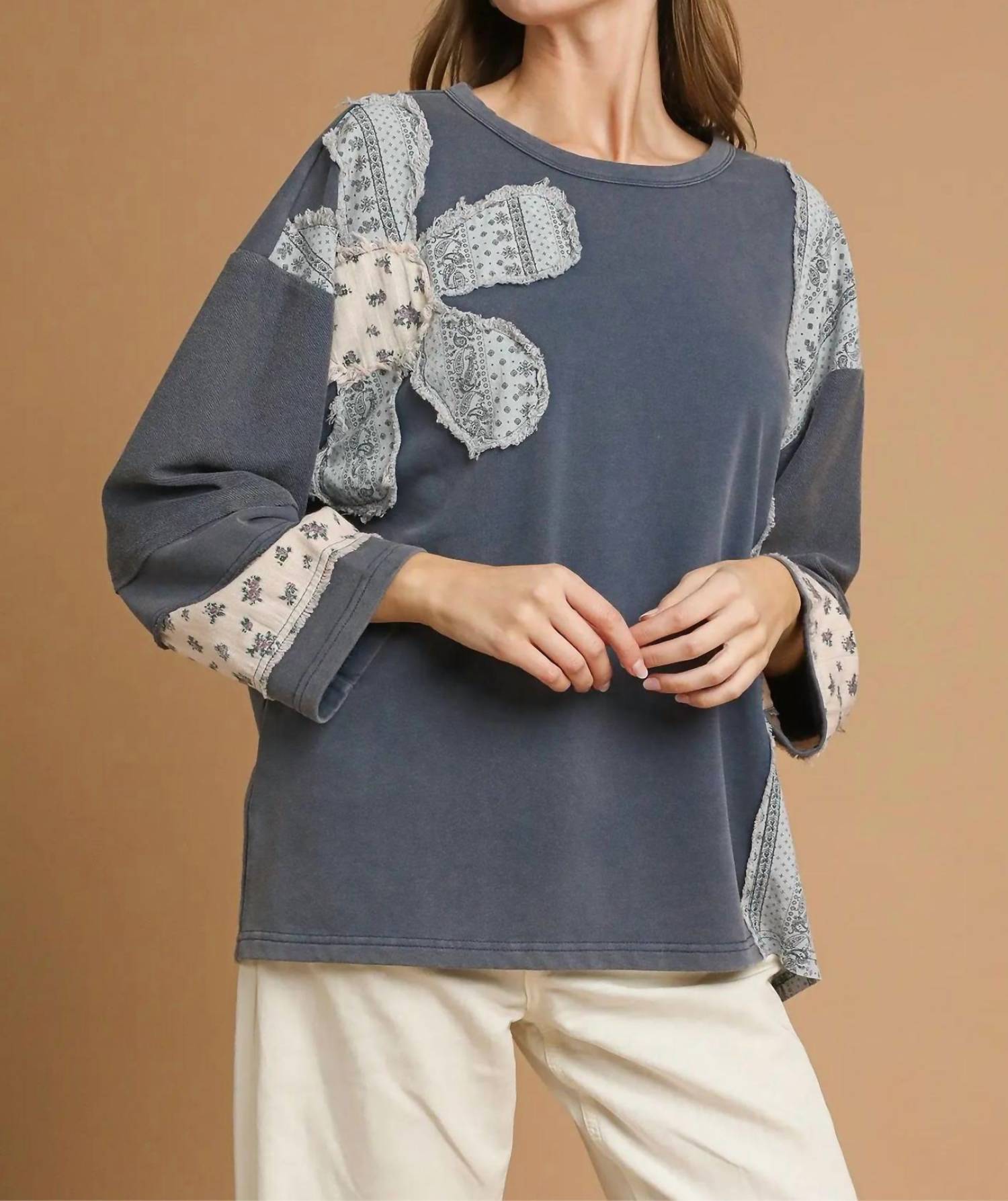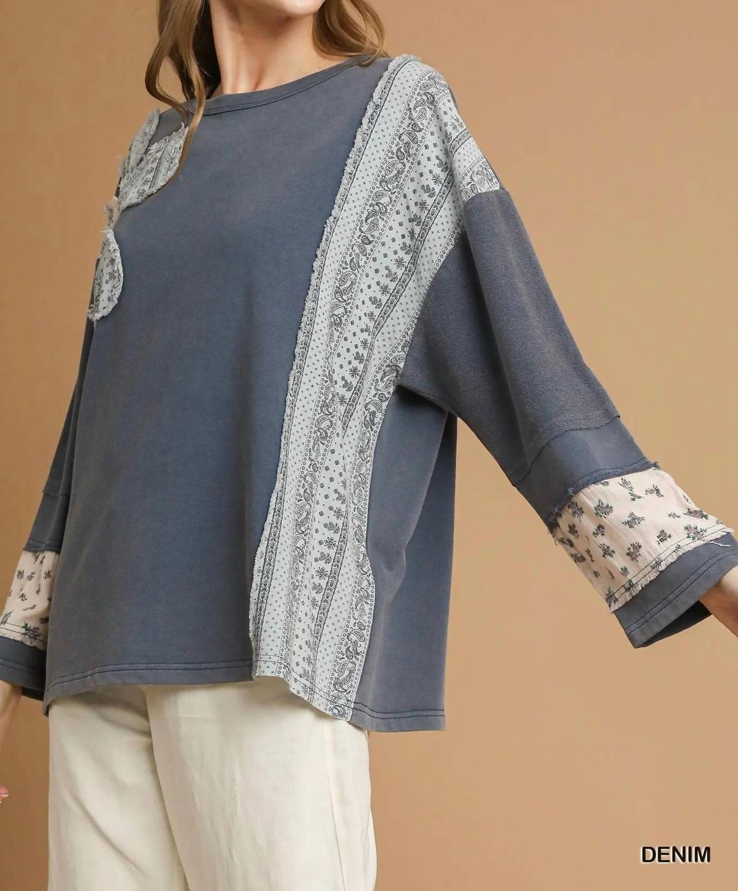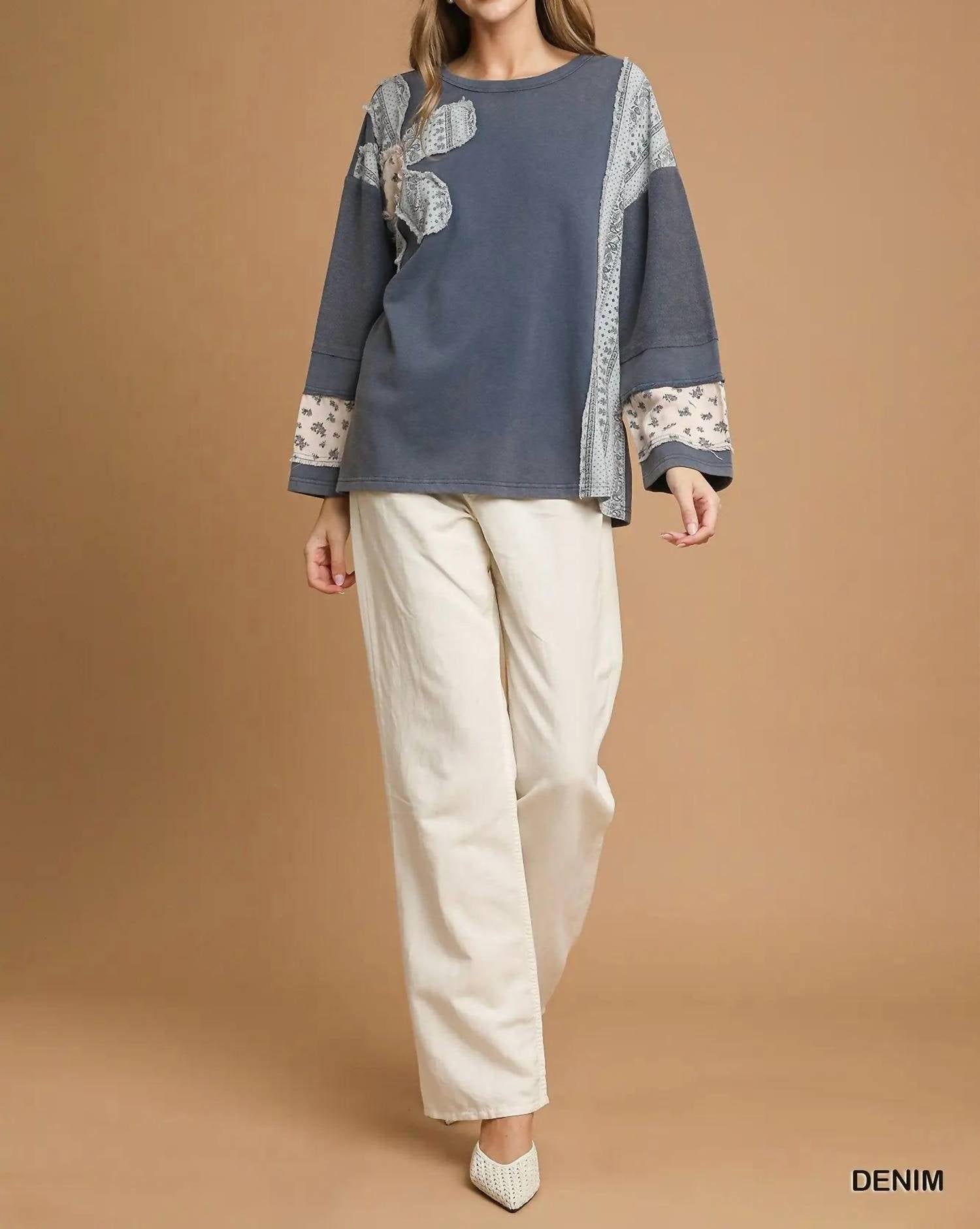 The perfect long sleeve tee that goes with just about anything. Elevate your casual style with the French Terry Patchwork Pullover by Umgee, a denim-hued essential for effortless chic. Featuring long, wide sleeves adorned with unique floral and paisley patchwork, this pullover offers both comfort and standout style. It's crafted from mineral-washed French terry, offering a soft, lived-in feel that you'll love. With a pull-on closure, it's easy to wear, and care is convenient with machine wash and tumble dry instructions.