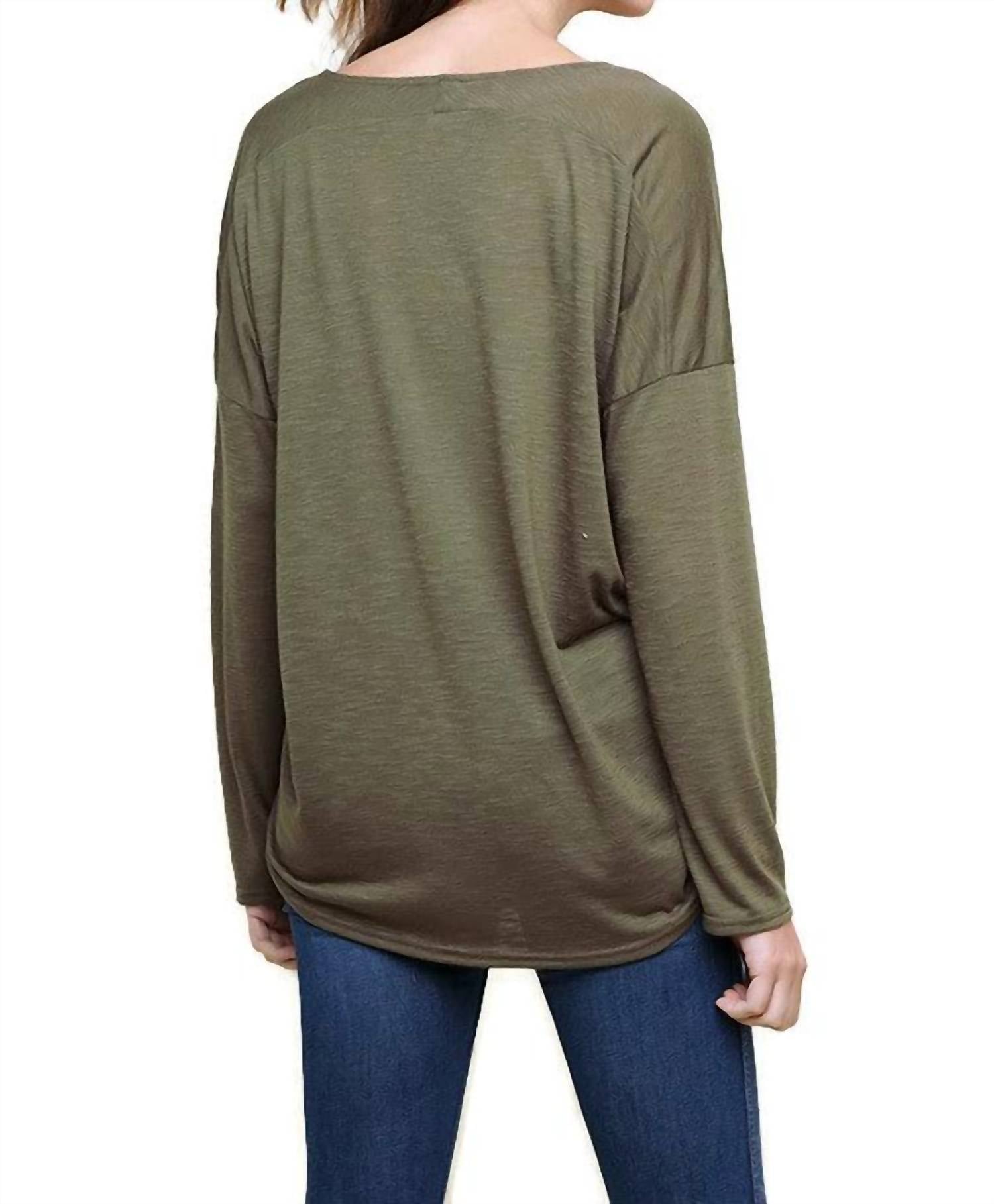 Great fit, cute design, soft fabric. You'll love everything about this long sleeve tee. The Heathered Front Knot Detail Top by Umgee, available in olive, is a perfectly chic addition to your wardrobe. Featuring long dropped sleeves, this top includes a stylish V-neckline and a front knot detail, offering an oversized silhouette that's flattering and comfortable. With a composition of 65% Polyester and 35% Rayon, it’s designed for effortless pull-on wear. Care instructions: This top is machine washable and can be tumble dried.