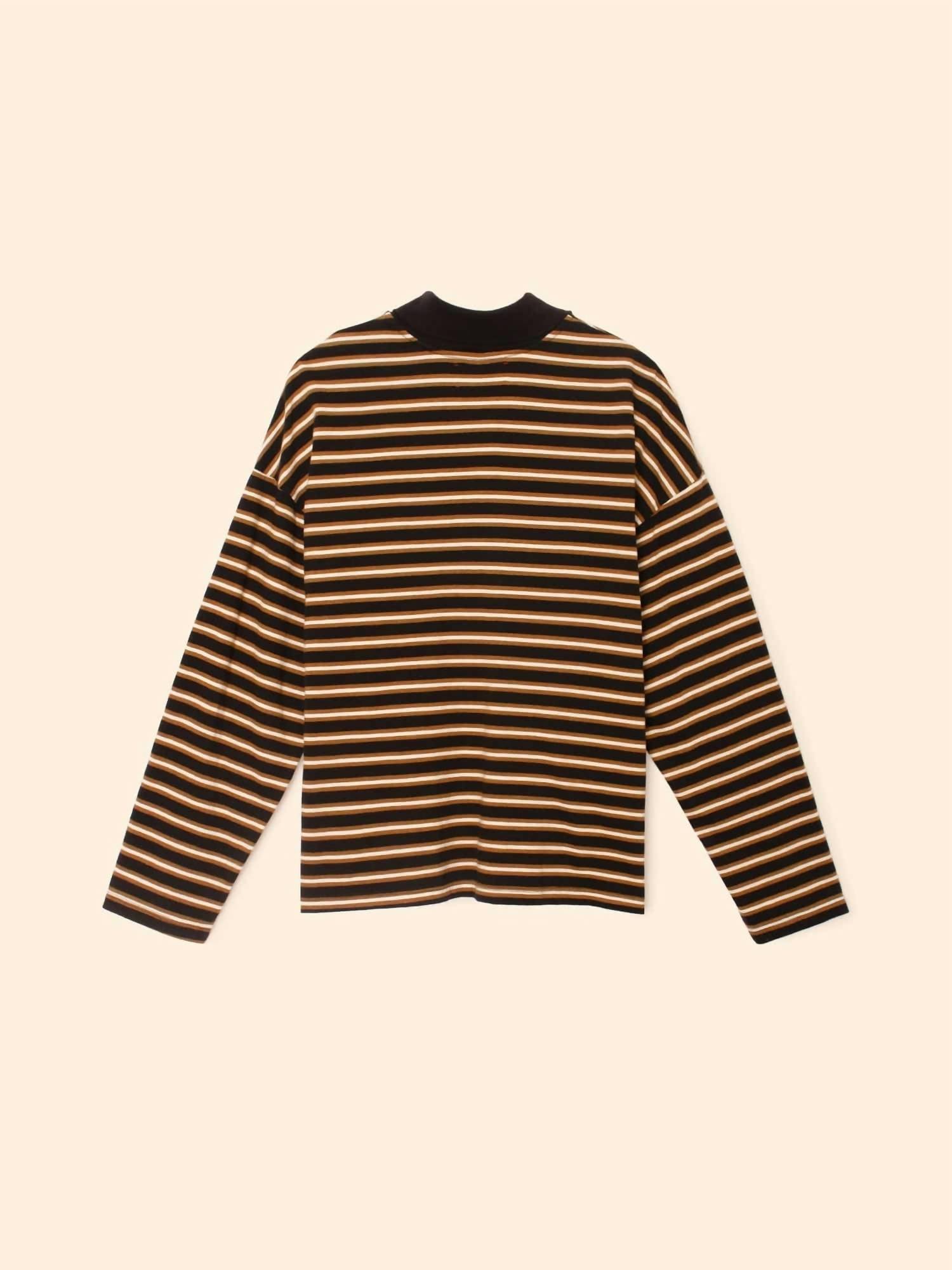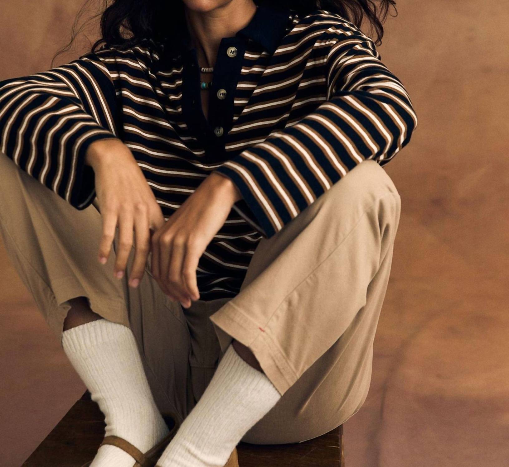 Great fit, cute design, soft fabric. You'll love everything about this long sleeve tee. Introducing the Clay Long sleeve Top by XIRENA, a must-have this season in a charming licorice stripe design. This classic rugby shirt features long sleeves and a henley button-front with a contrast collar and placket. Made from 100% soft cotton jersey and crafted in Los Angeles, it offers both style and comfort. Care for this minimalist piece by machine washing on a cold gentle cycle and tumble drying on low.